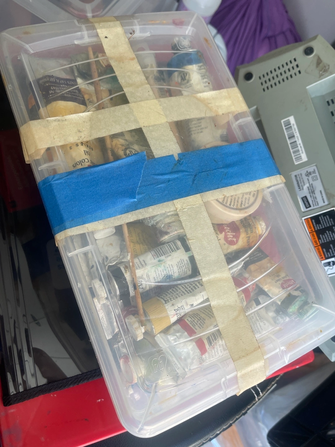 Various paints and art supplies. Pre-owned, some tape residue. Includes tubes of paint, brushes, and other materials. All items are in a clear plastic storage container.