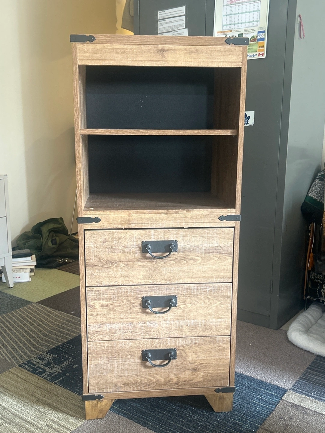 Free-standing cabinet. Three drawers and open shelving. Distressed wood finish. Black metal hardware. Perfect for storage.