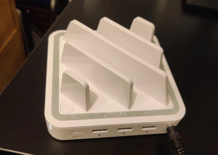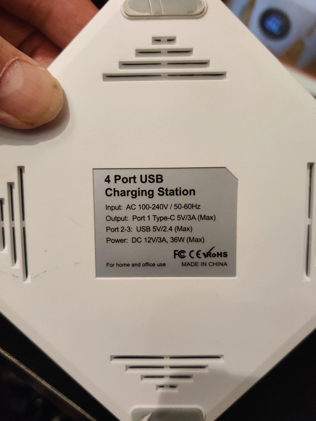 White multi-device charging station. Four ports; one Type-C. Input: AC 100-240V / 50-60Hz. Output: Port 1 Type-C 5V/3A (Max), Ports 2-3 USB 5V/2.4A (Max). Power: DC 12V/3A, 36W (Max).