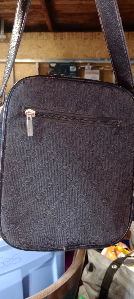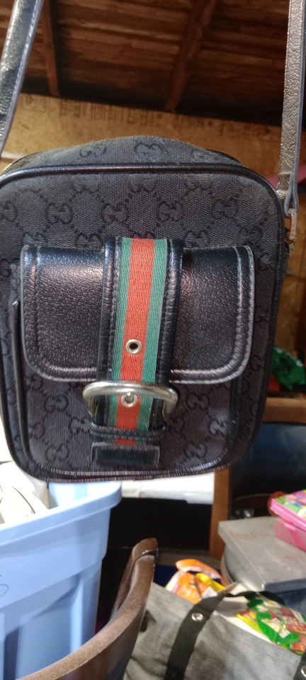 Vintage Gucci crossbody bag. Features GG monogram canvas and leather accents. Adjustable shoulder strap. Small zipper pocket on the back. Front flap with buckle closure.