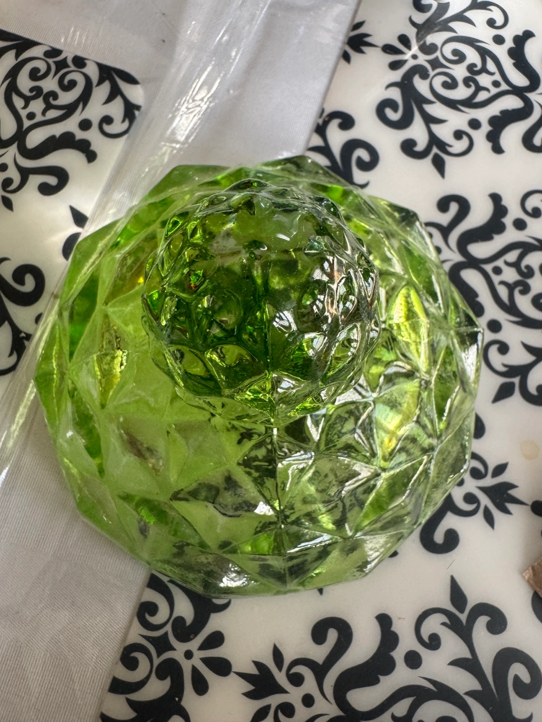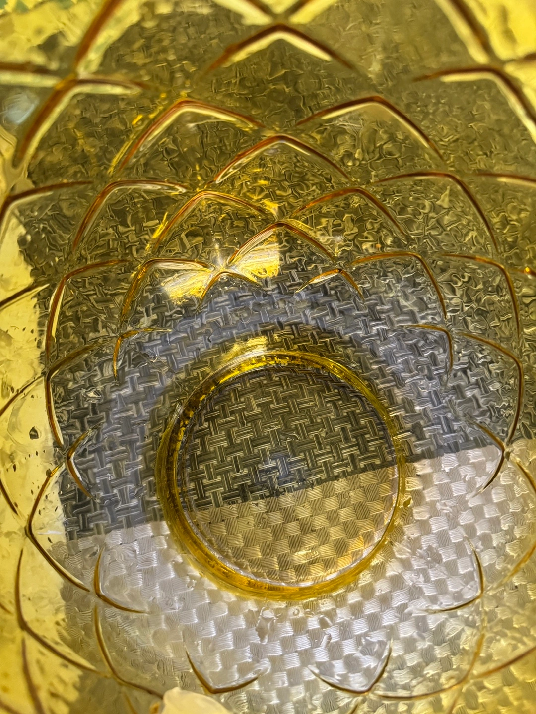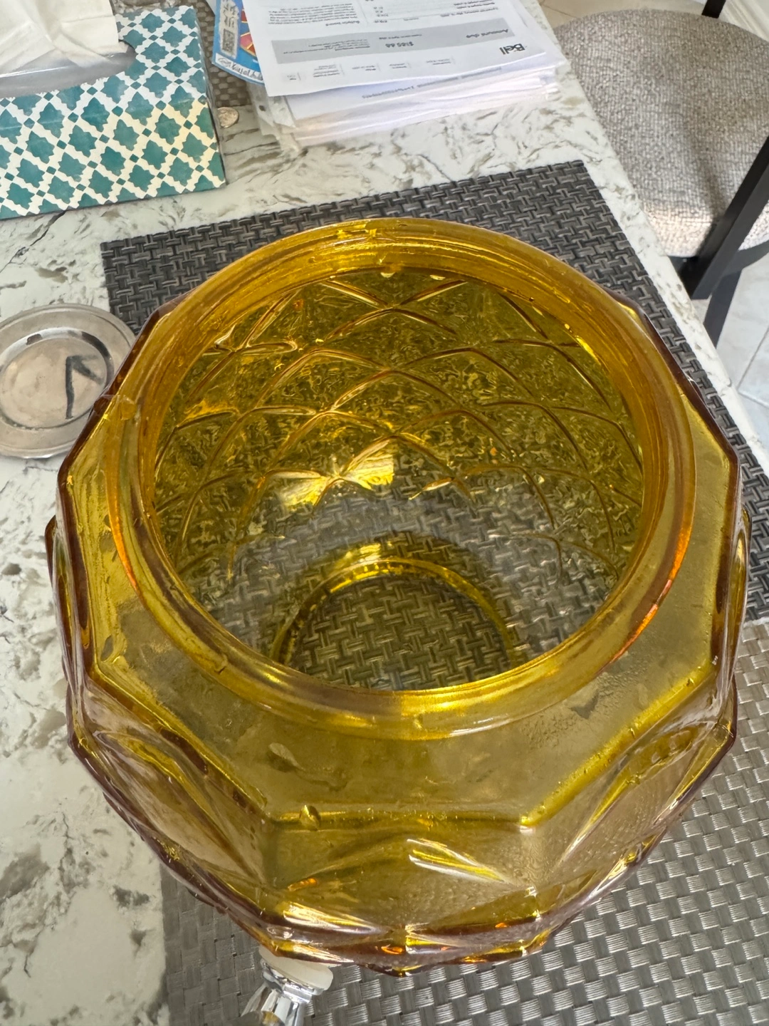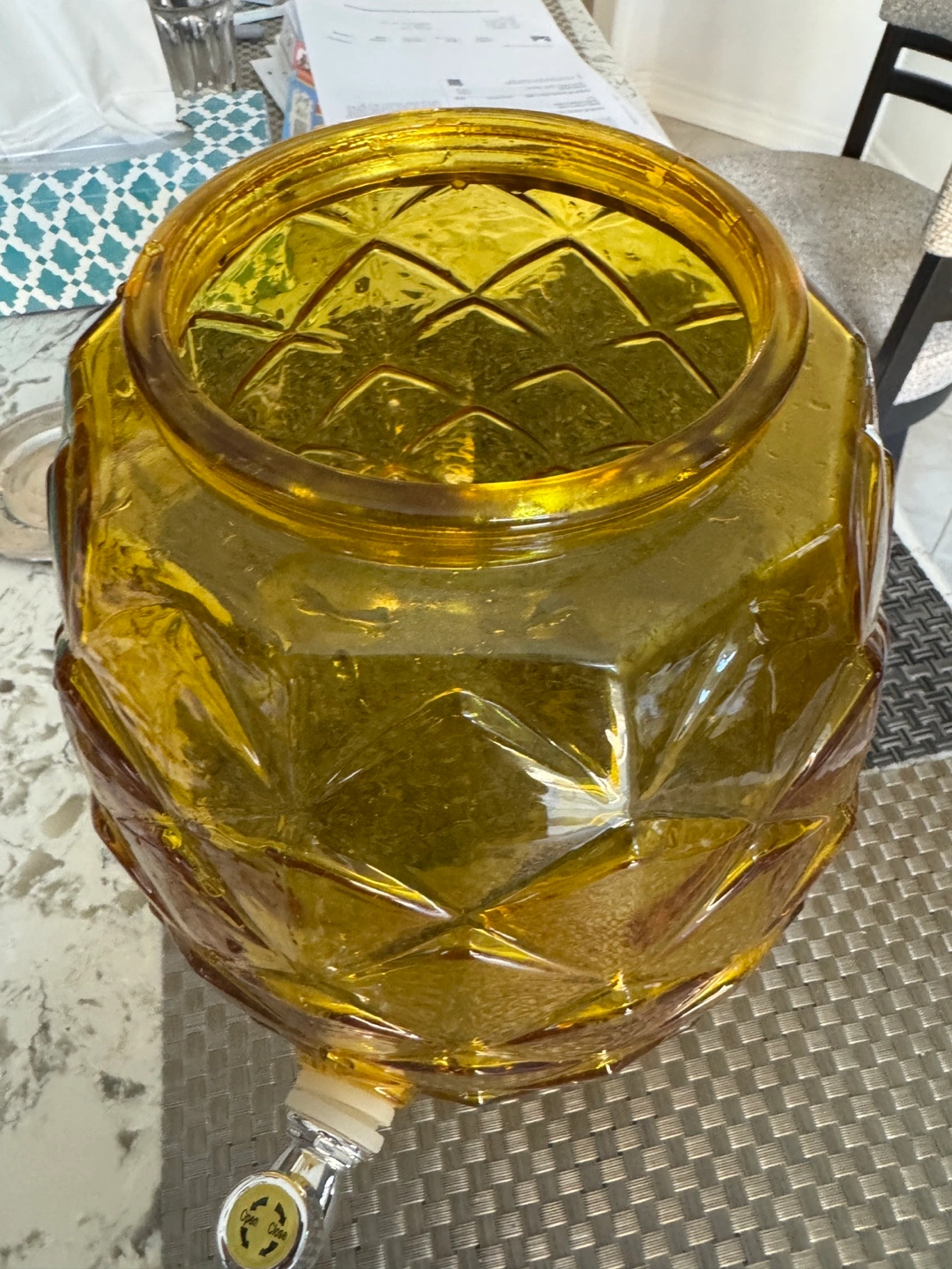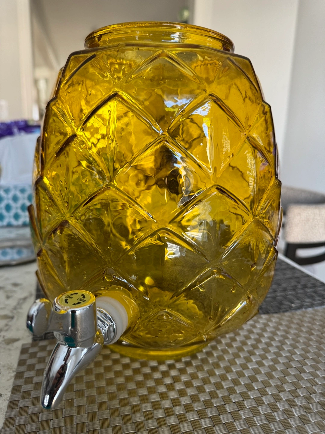 Large amber glass beverage dispenser. Pineapple-shaped design. Features a built-in spigot for easy pouring. Unique and stylish addition to any home.