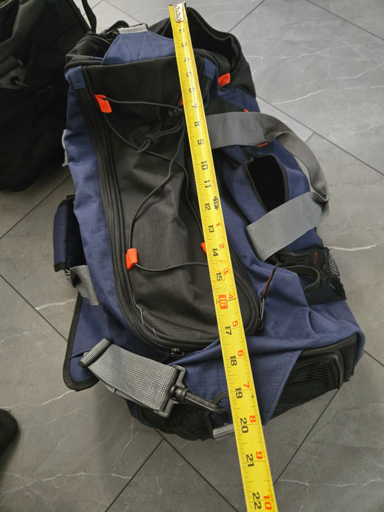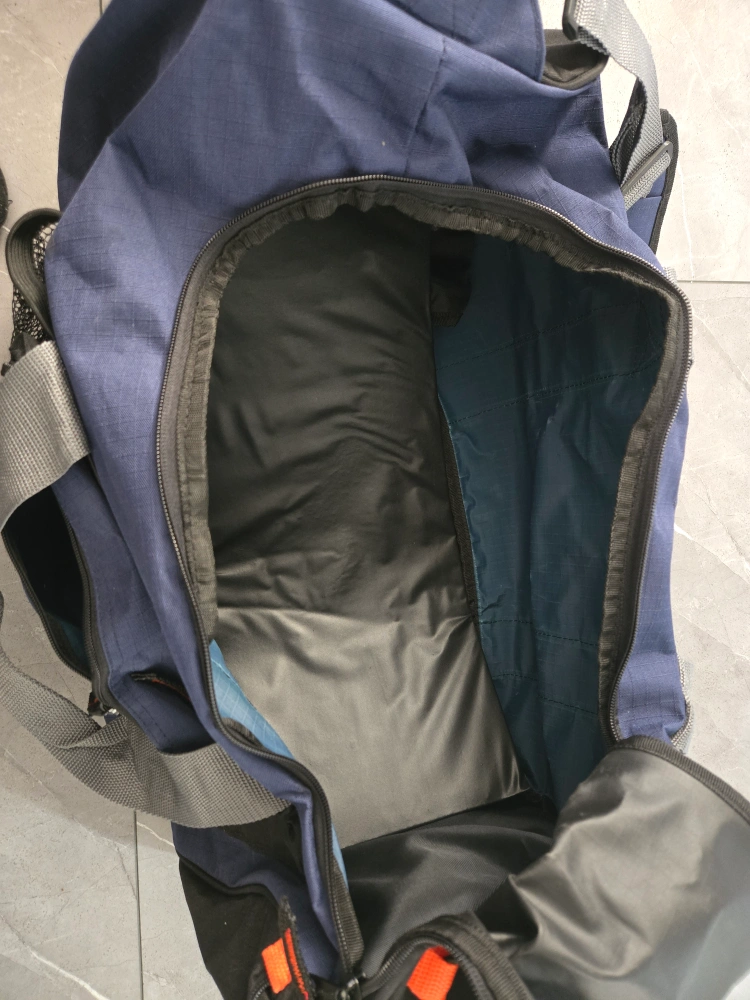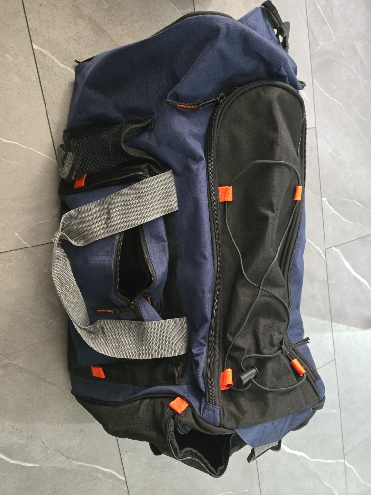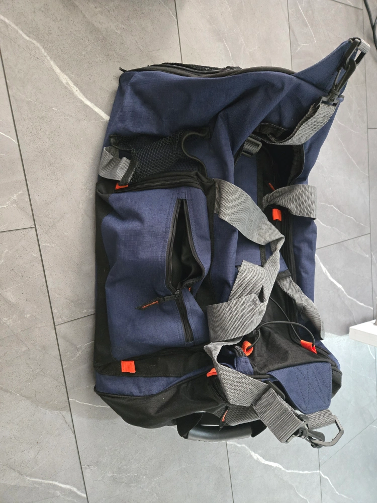 348Spacious duffle bag. Blue and black colour scheme. Multiple pockets and compartments. Durable material. Great for travel or sports. Never used. See other listing for larger and small duffle bag with wheels and handel
