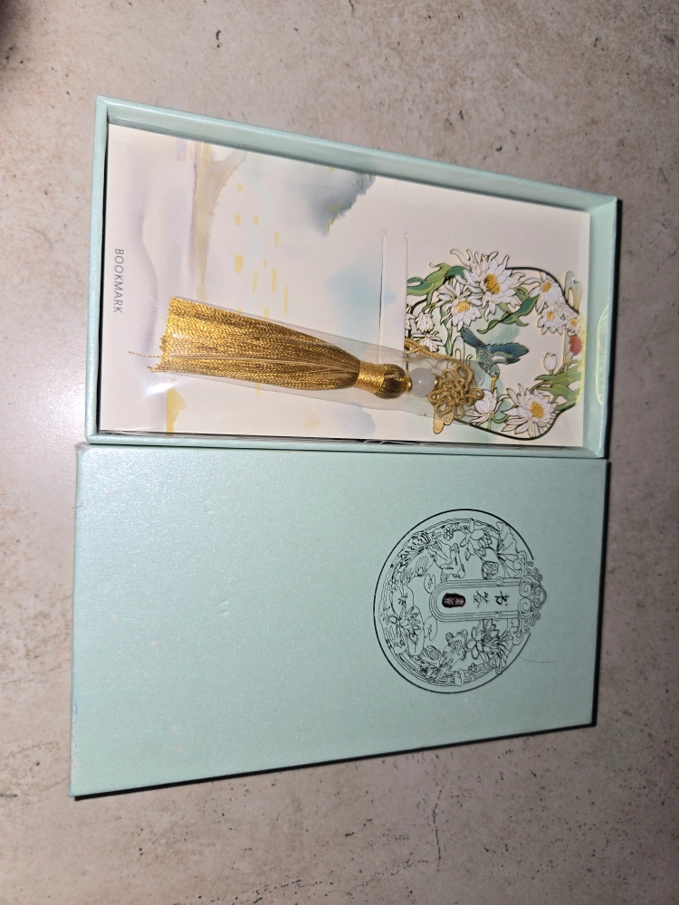 Beautiful bookmark, floral design, gold tassel. Comes in a mint green gift box. Bookmark itself in original clear plastic packaging. Perfect gift or for personal use. Metal bookmark with a jade accent.