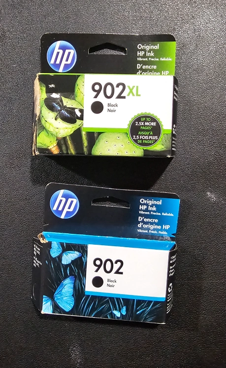 700Two New HP ink cartridges. One is a standard 902 and the other is a 902XL high-yield. Both are black ink.