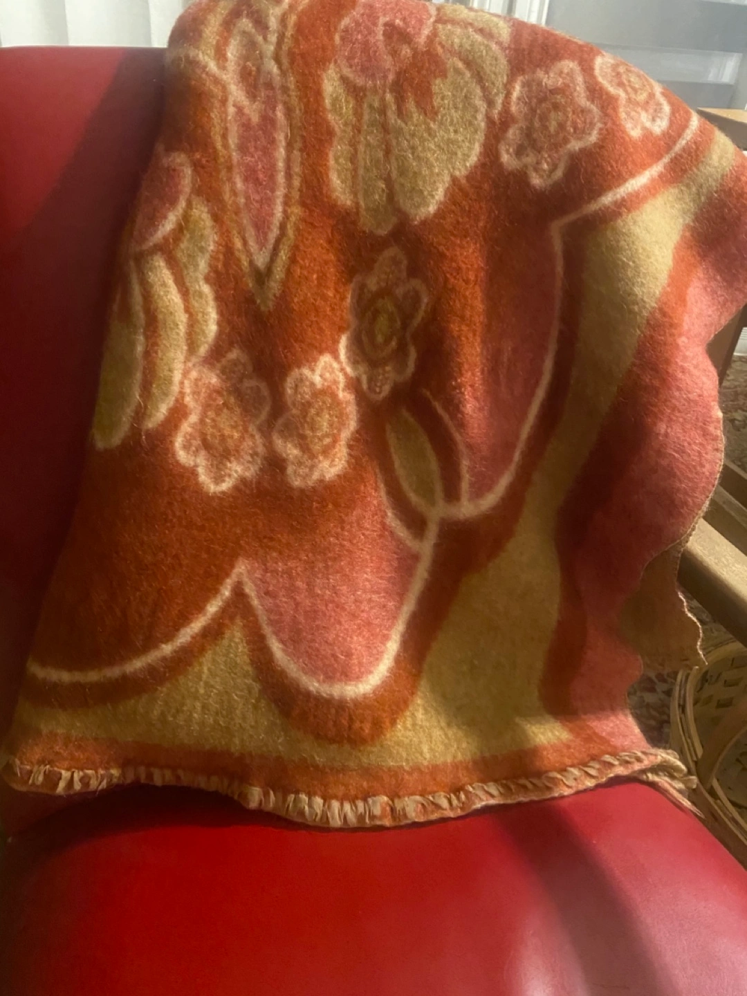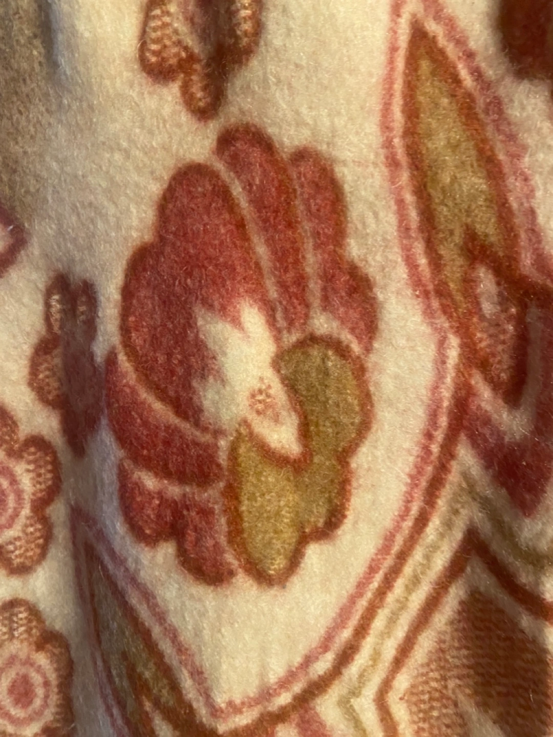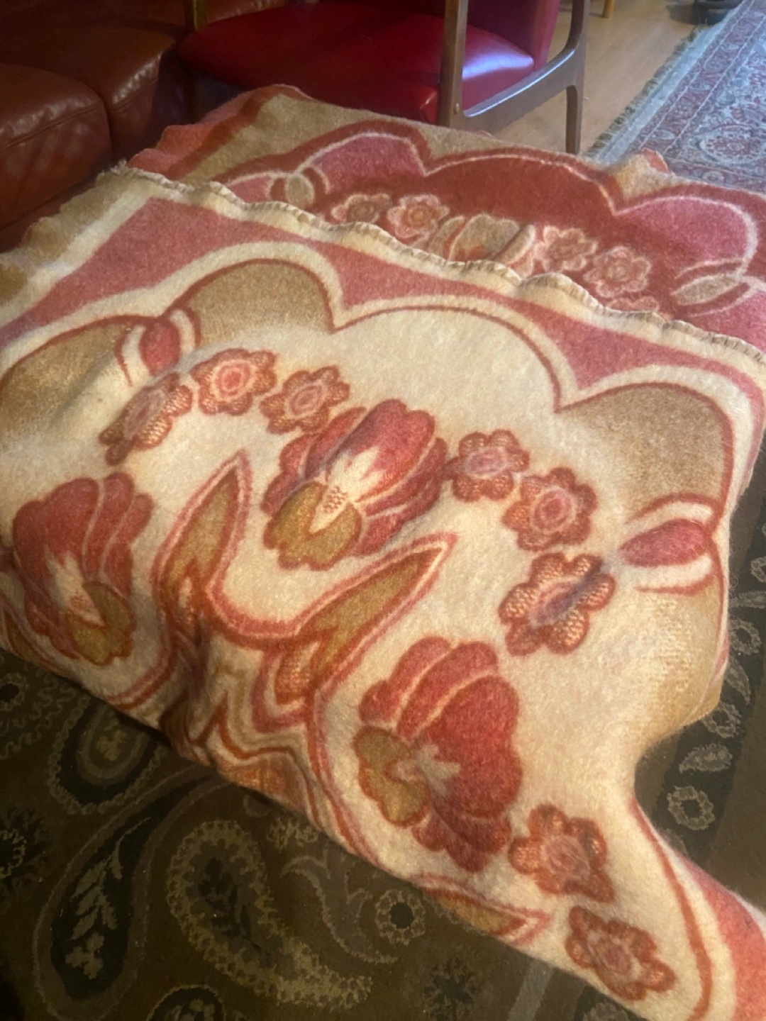 Unique vintage throw blanket. Features a floral pattern in shades of pink, and beige. Soft and cozy. Great for adding a touch of vintage charm to your home.