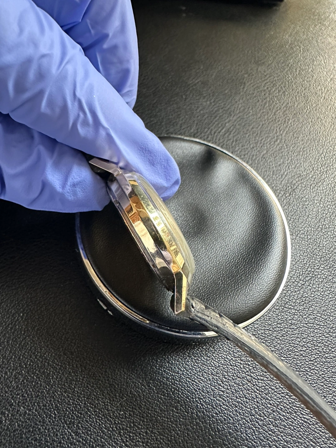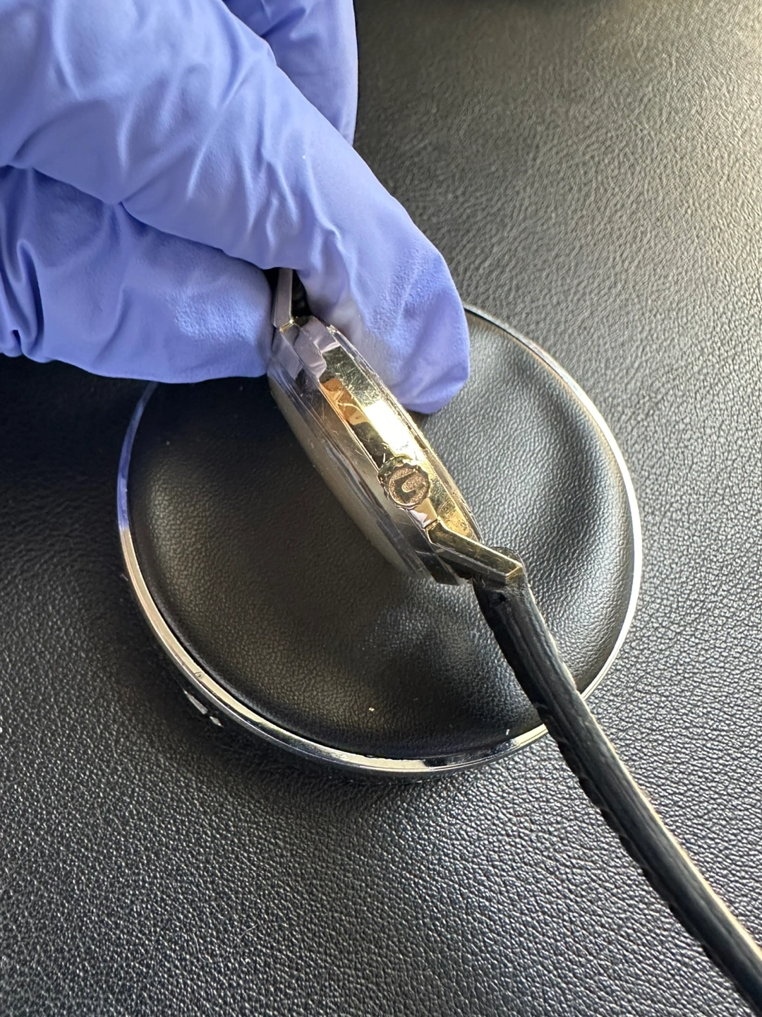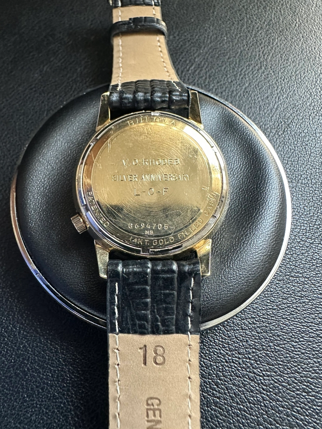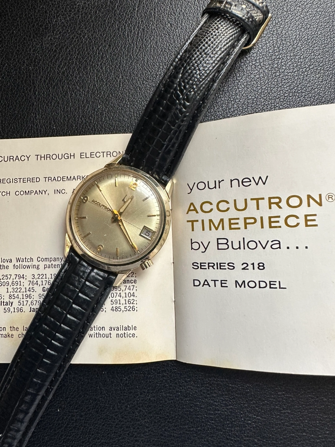 67Gold-tone men's wristwatch. Black leather band. Date function. Accutron timepiece. Series 218. Vintage condition. Includes original paperwork. Just serviced. Running Great