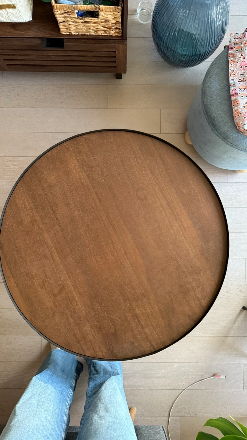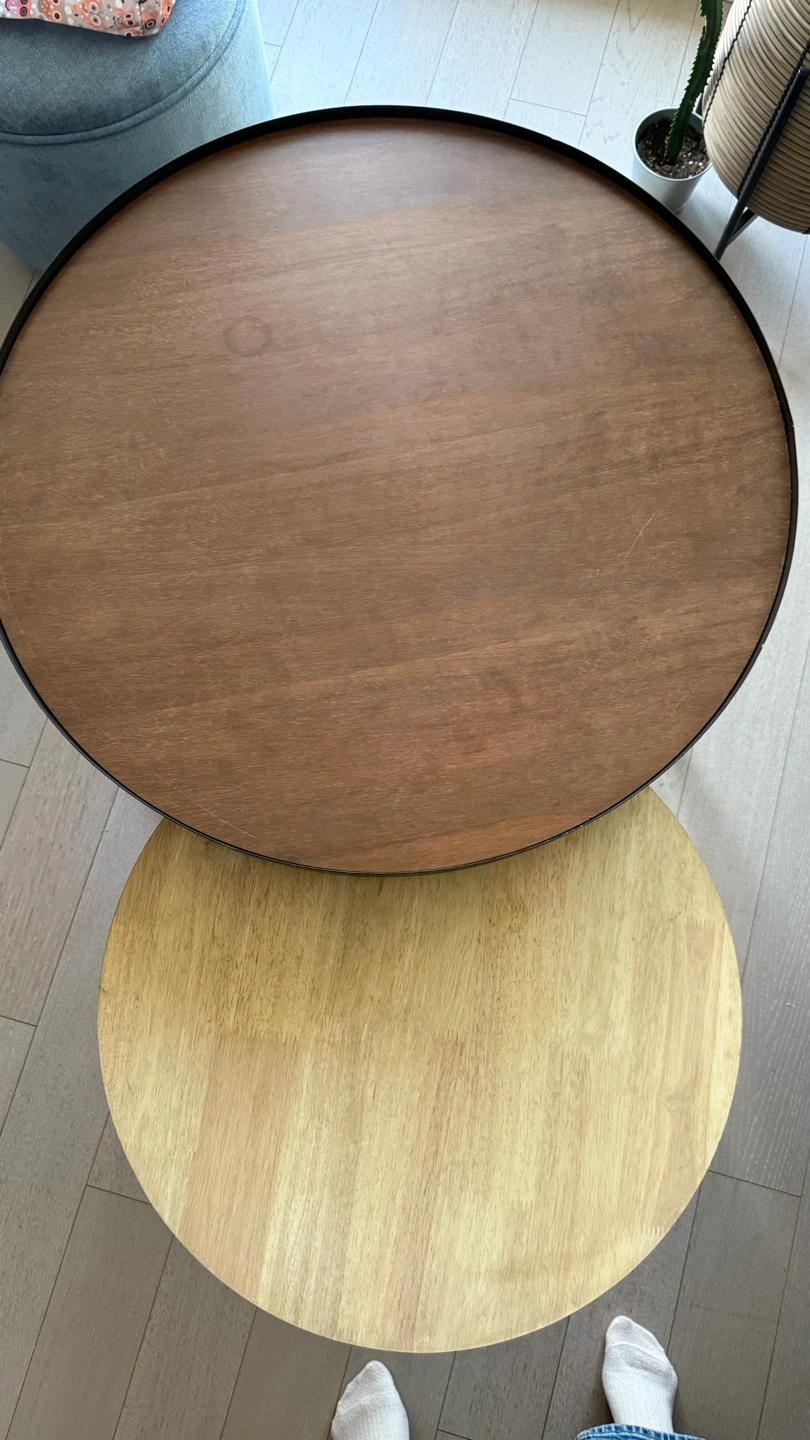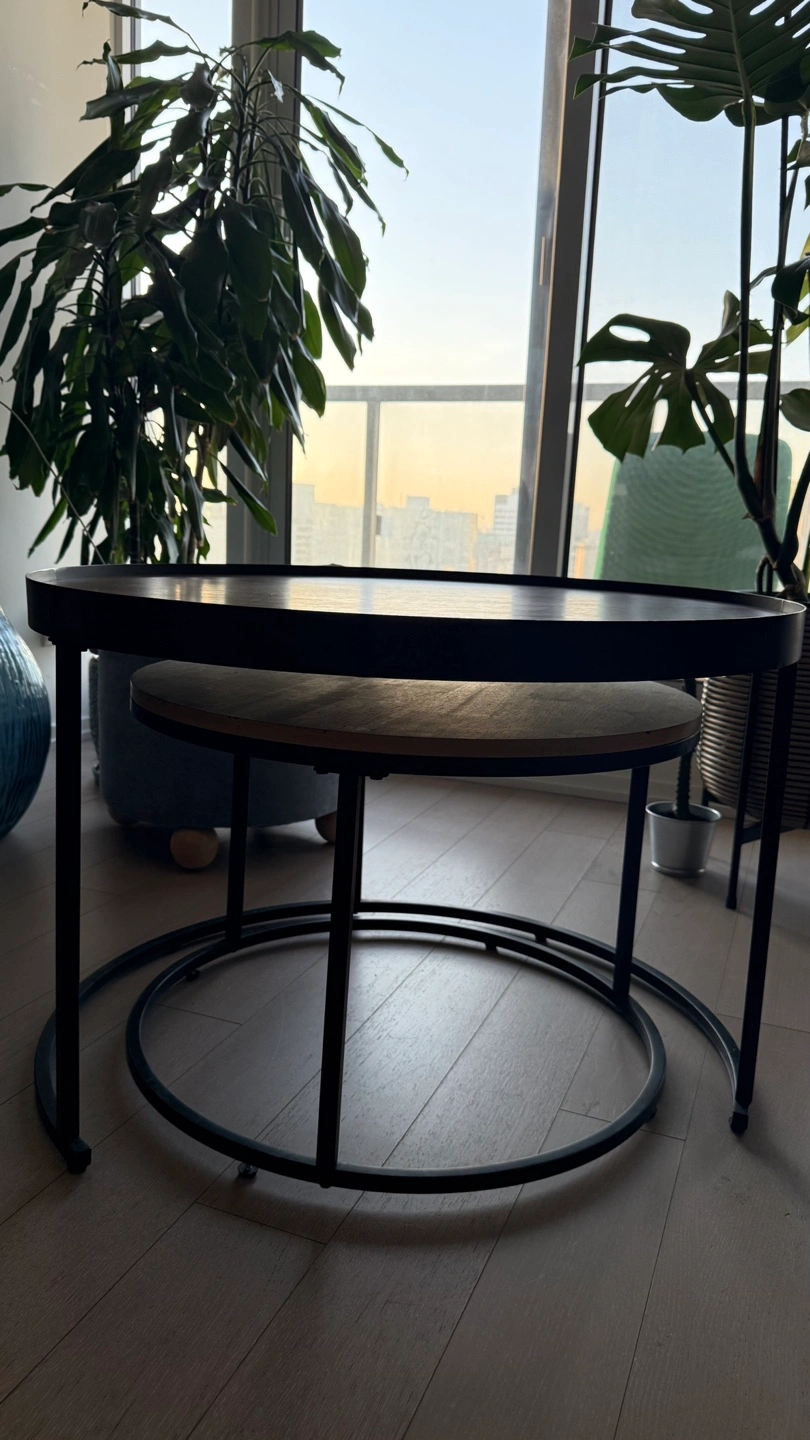 Selling a 1 year old, very sturdy dual-tone nesting table set that is ideal for small spaces, as the two pieces nest together to save space. When more surface area is needed, simply separate them for extra functionality.
