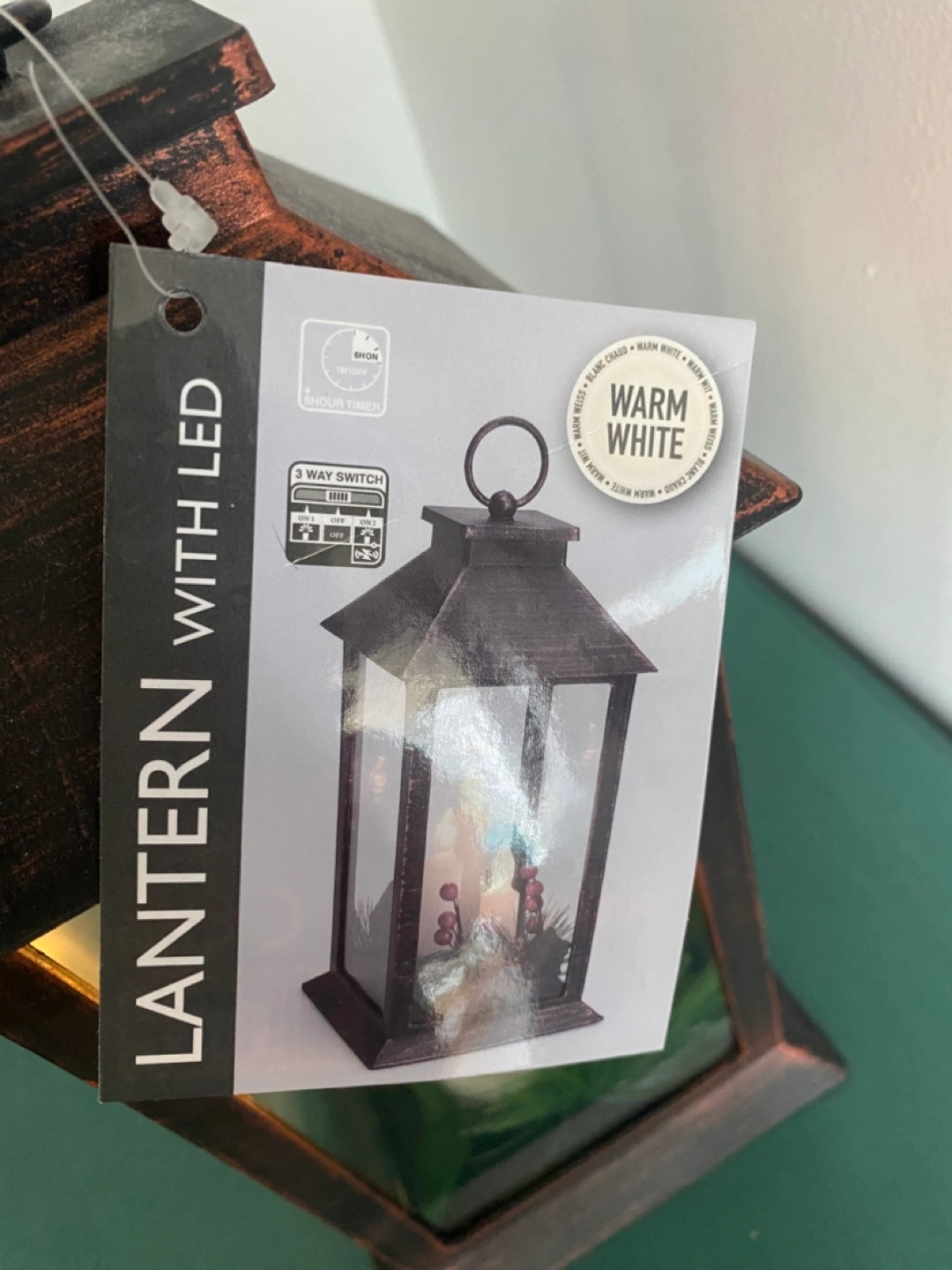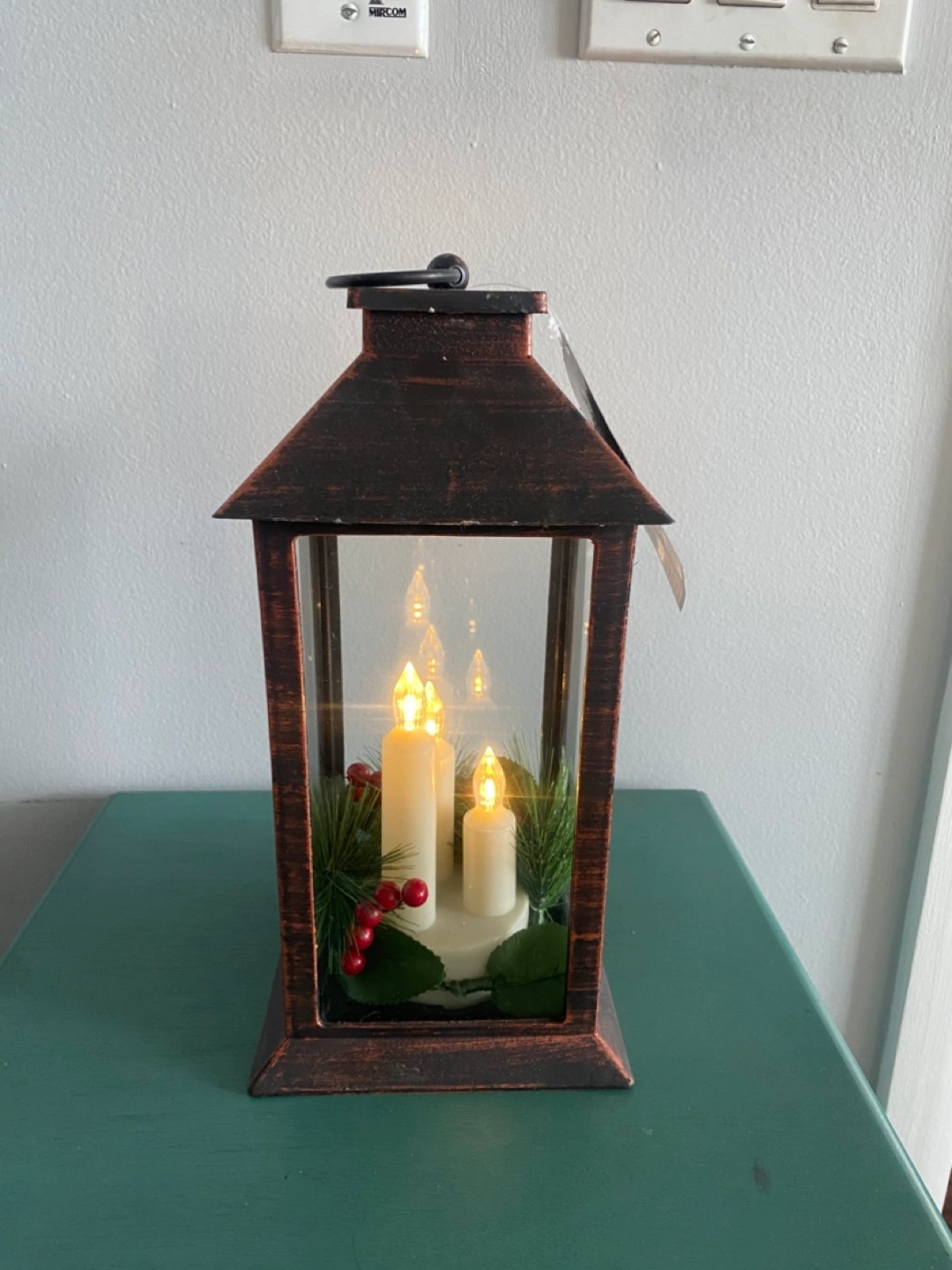 Metal lantern features LED candles, berries, and pine. Three-way switch: on, timer, off. Warm white light. Perfect for holiday decor.