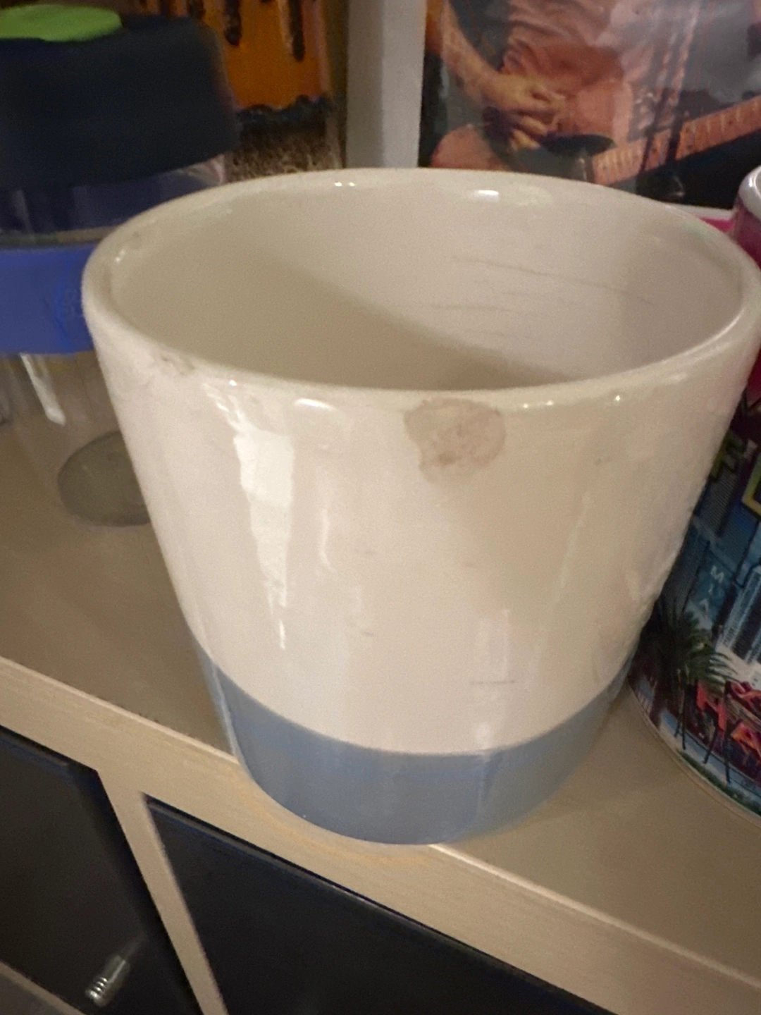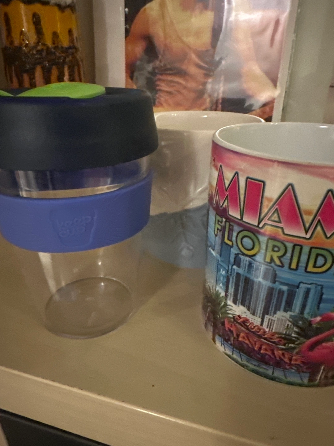 Reusable KeepCup and two mugs. One is a KeepCup, the other is a Miami, Florida souvenir mug and the last is a snowflake two-toned mug., this one is chipped.