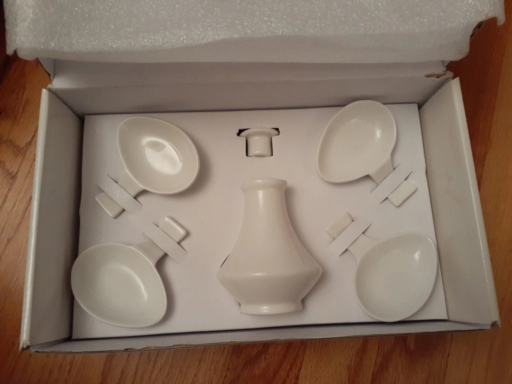269New, unused condiment set. Includes four small bowls and one small vase. Perfect for soy sauce, spices, or other condiments.