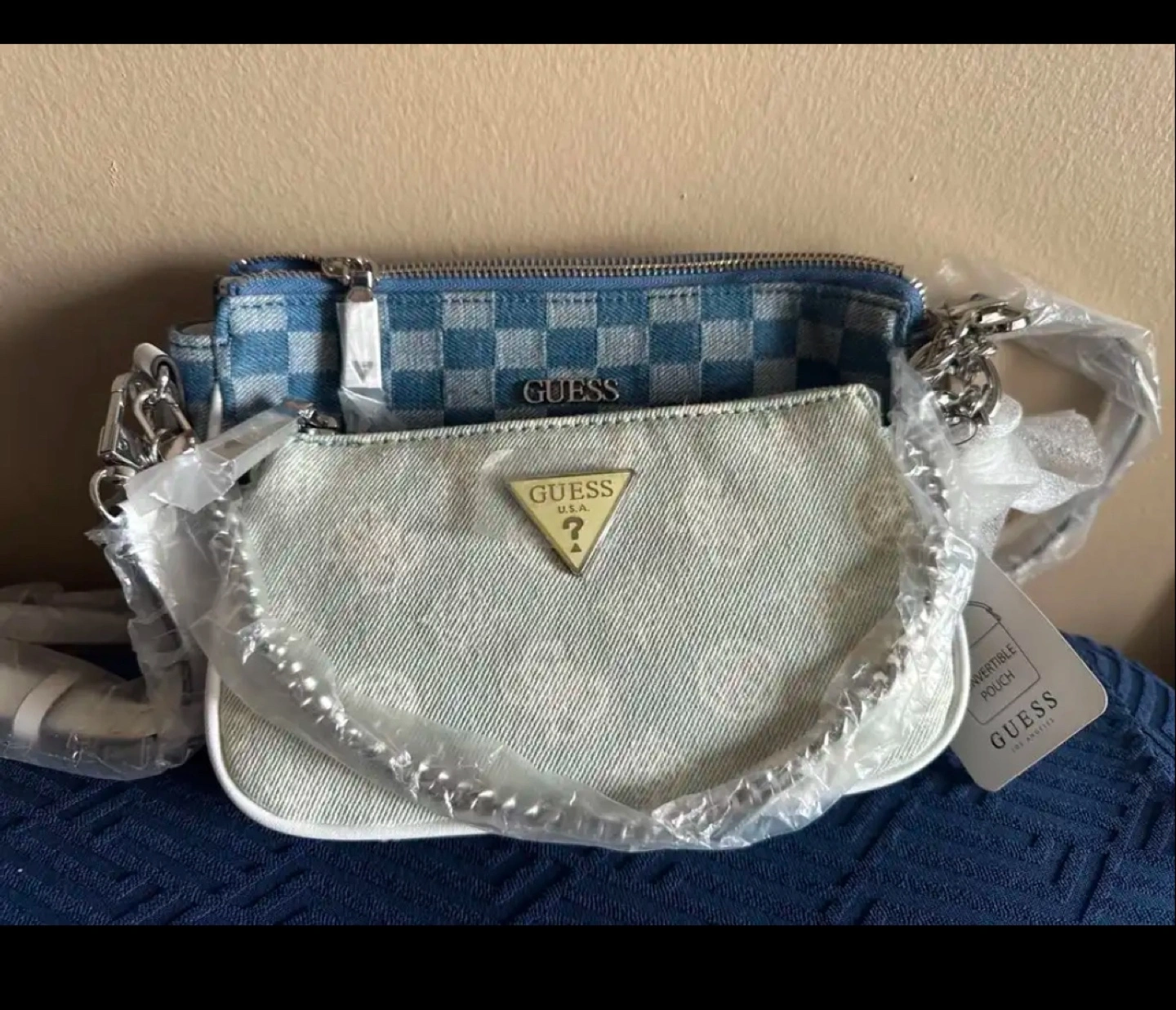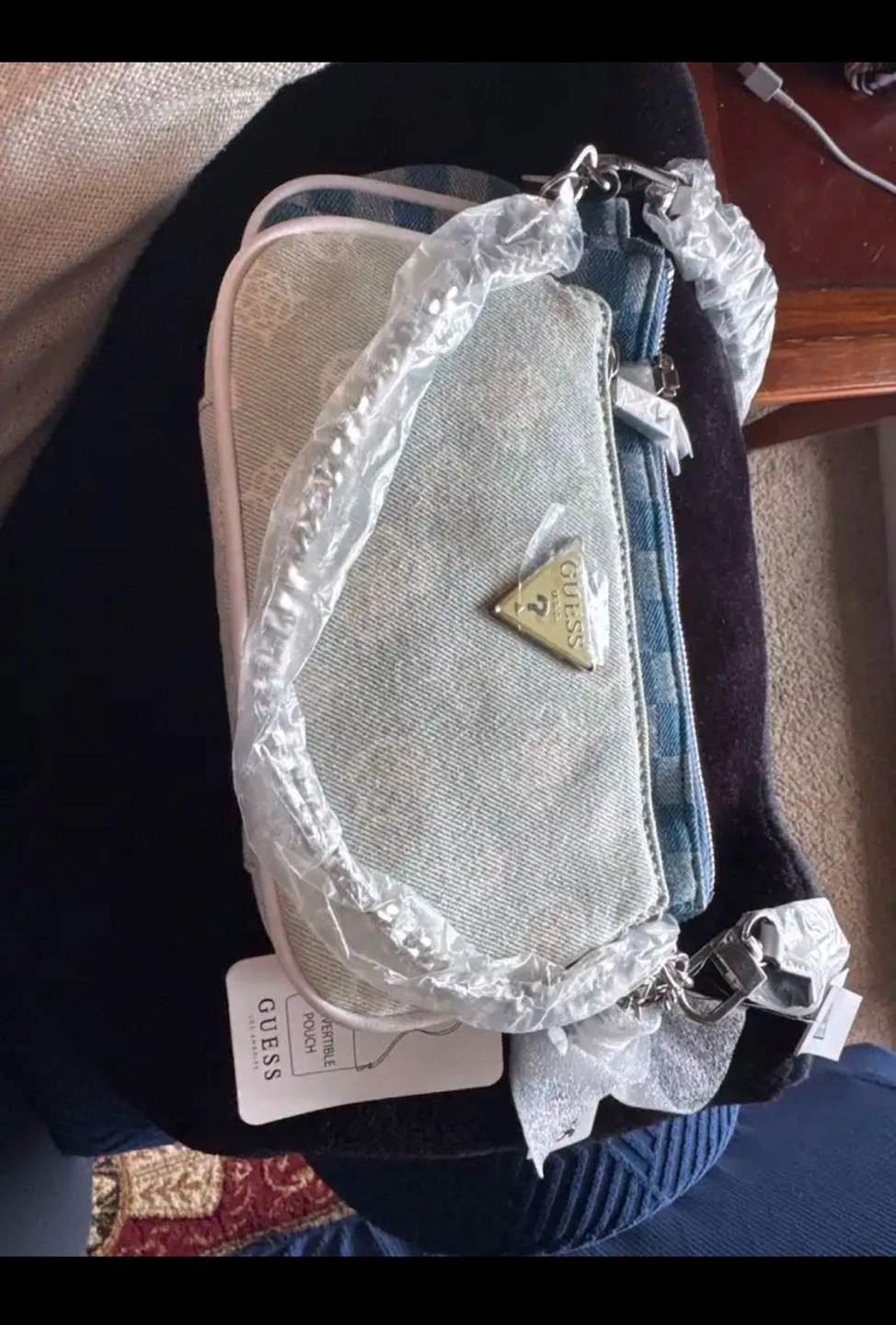 Adorable Guess handbag. Features a denim and checkered pattern. Baguette style. New with tags.
