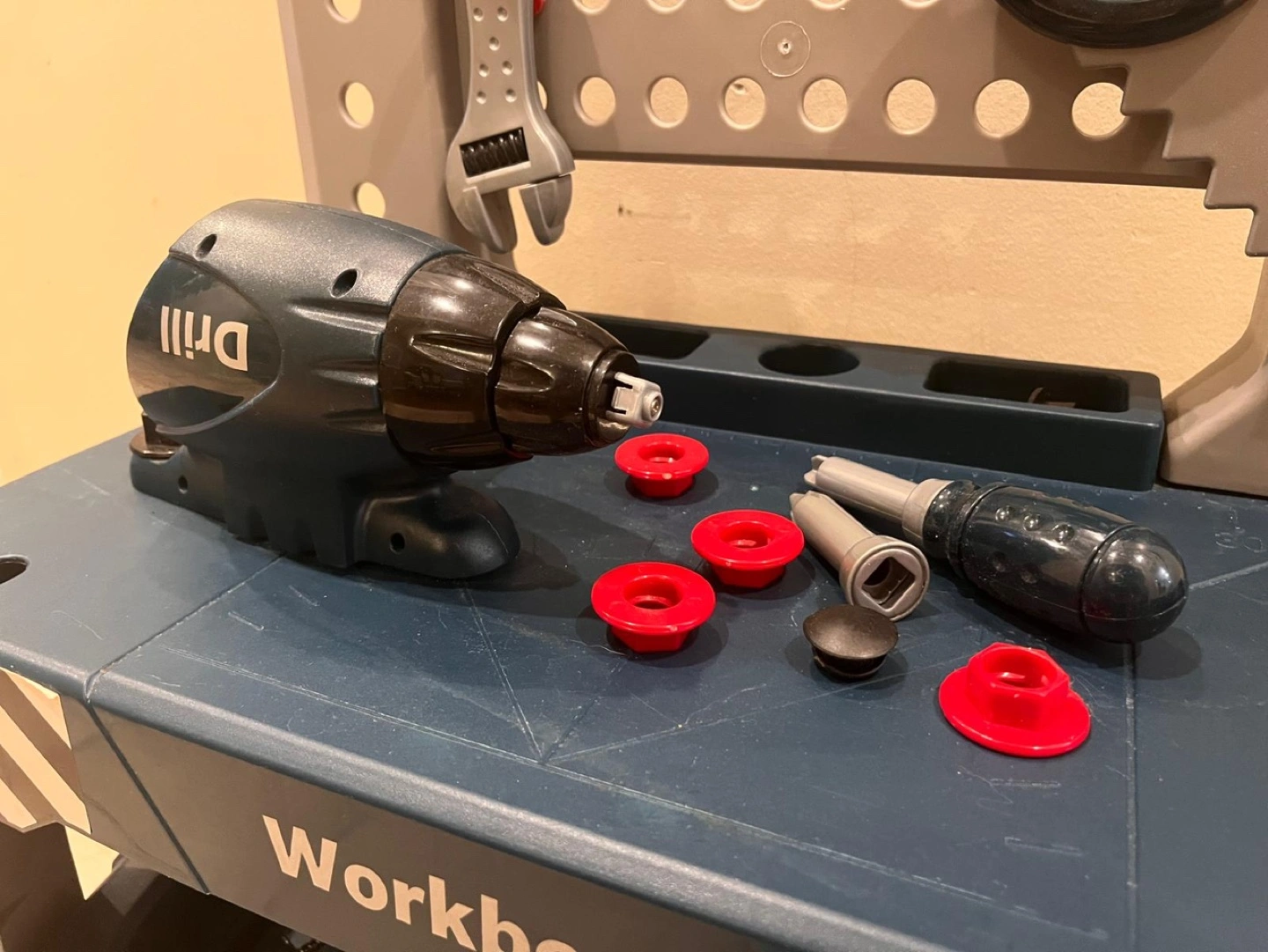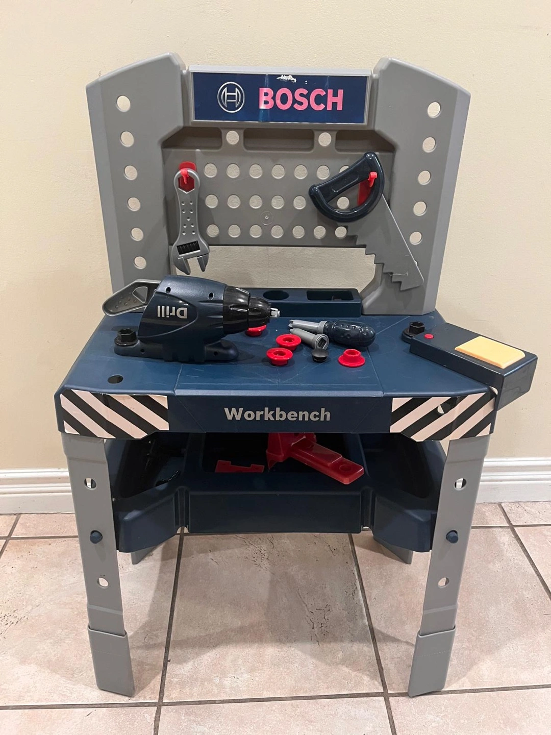 40Play workbench for children. Includes drill, saw, wrench, and other tools. Durable plastic construction. Great for imaginative play.