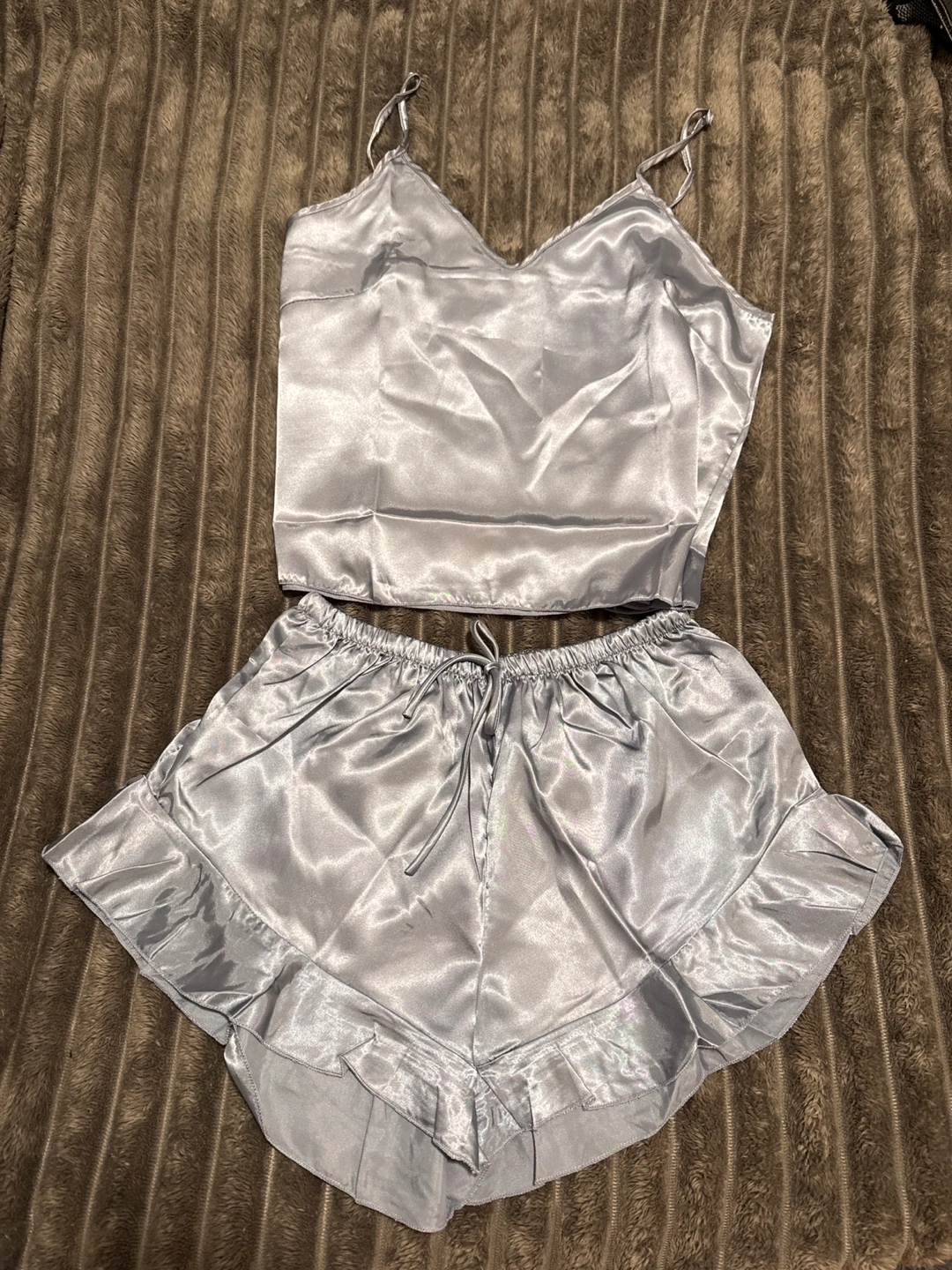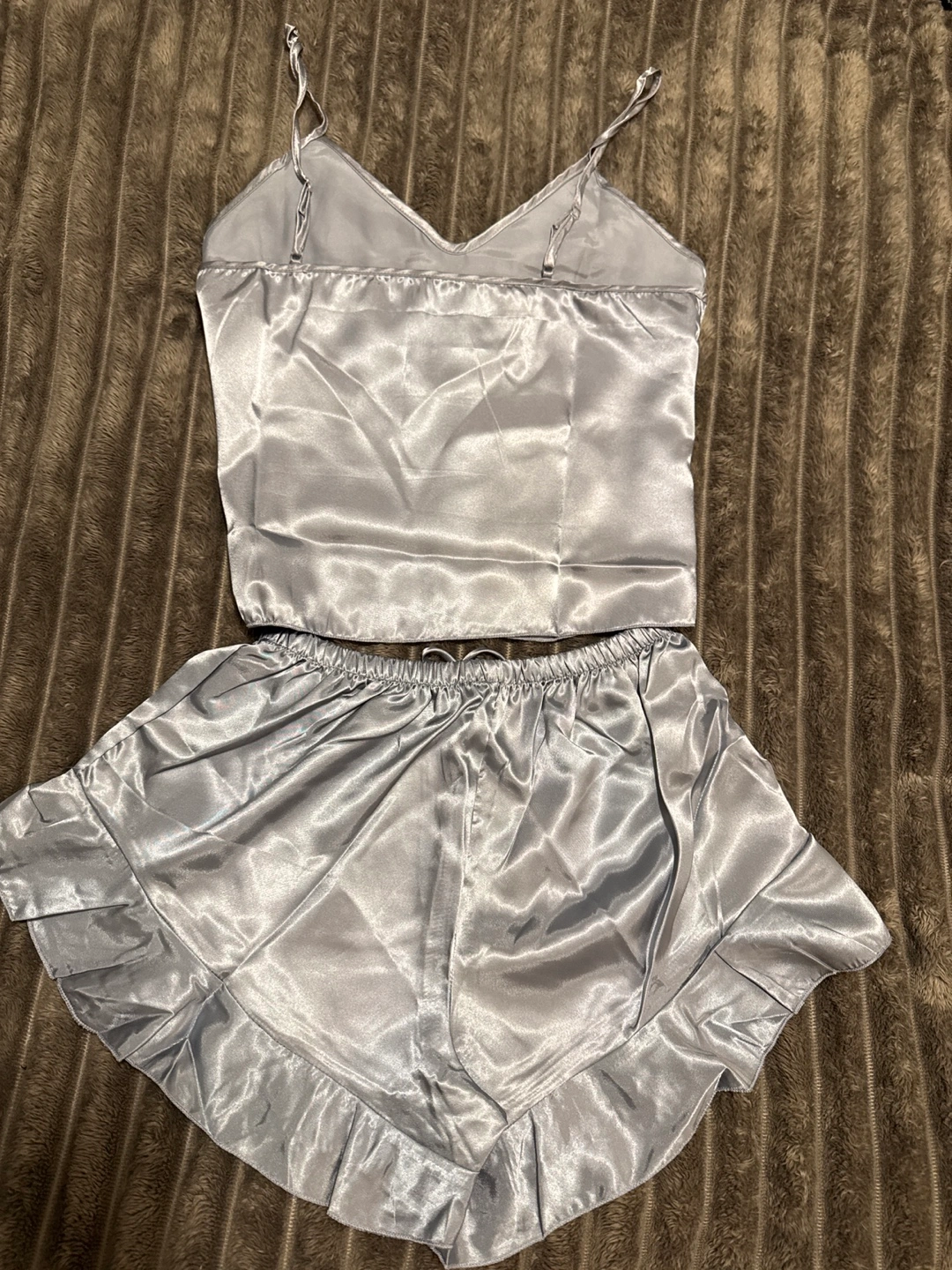 Beautiful silver satin pajama set. Includes a cami top and shorts. Adjustable straps on the top. Shorts have a ruffled hem and drawstring waist. Perfect for lounging.