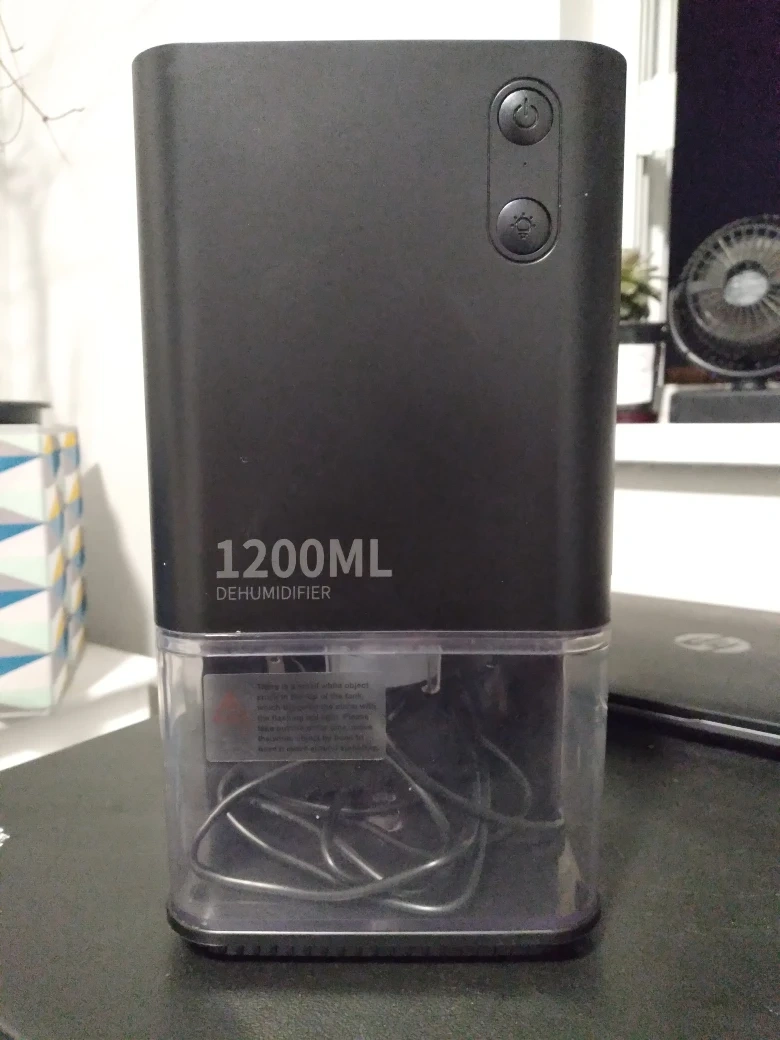 Portable dehumidifier. 1200ML capacity. Compact design. Perfect for small spaces. Includes power cord. Used just once.