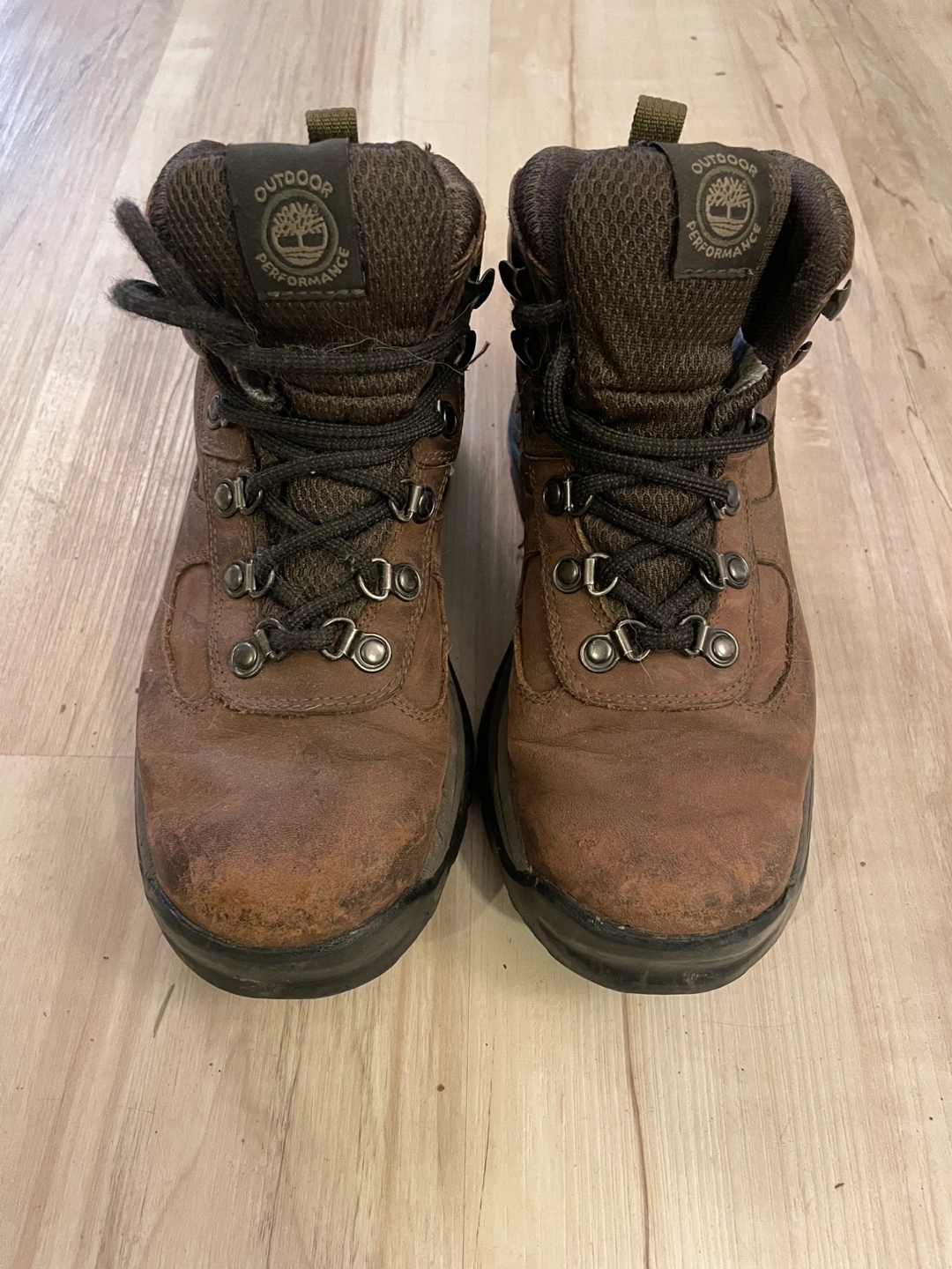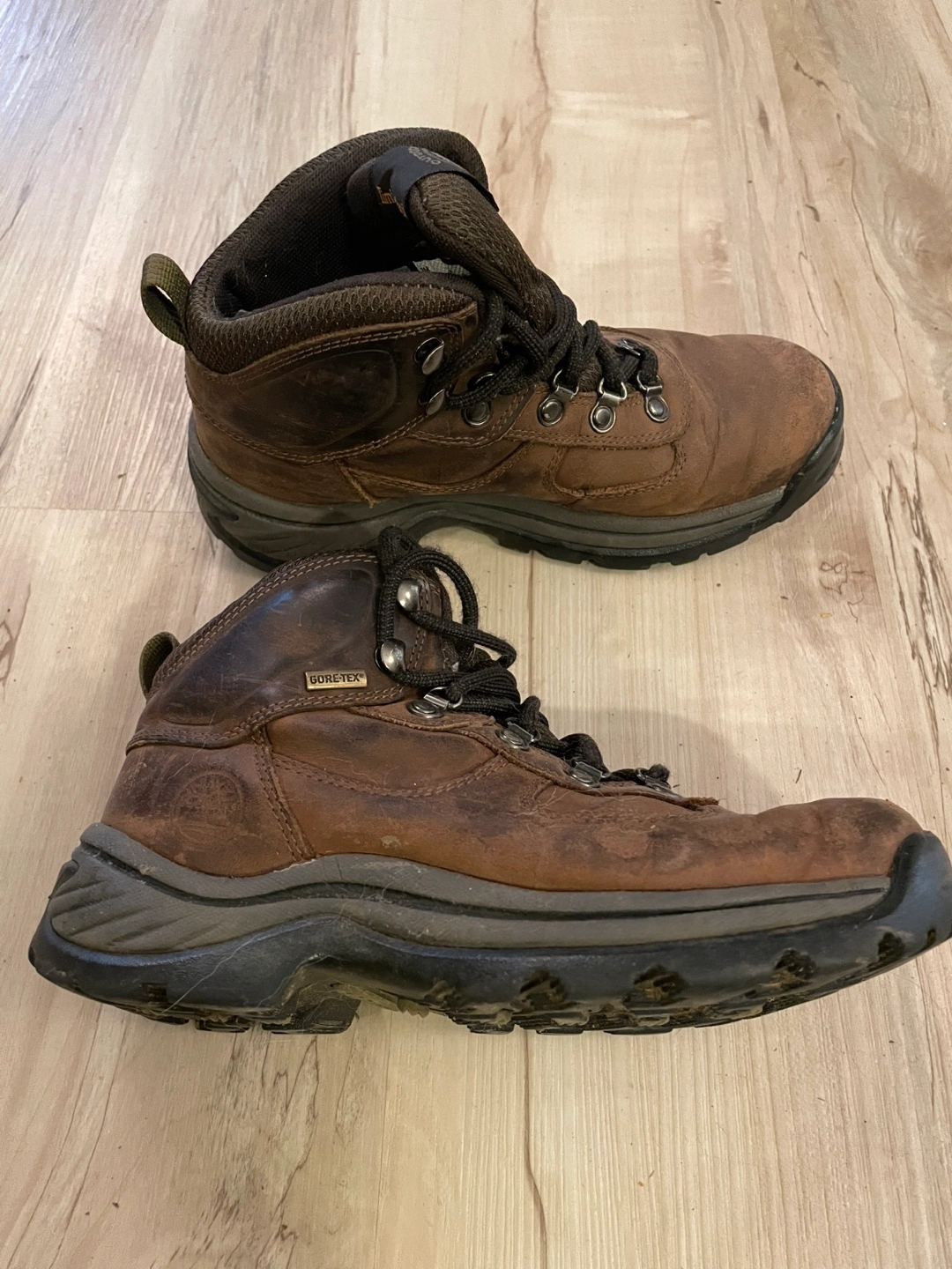 Used brown leather Timberland hiking boots. Women’s Size 6M. Gore-Tex. In good condition, no rips, lots of sole left.