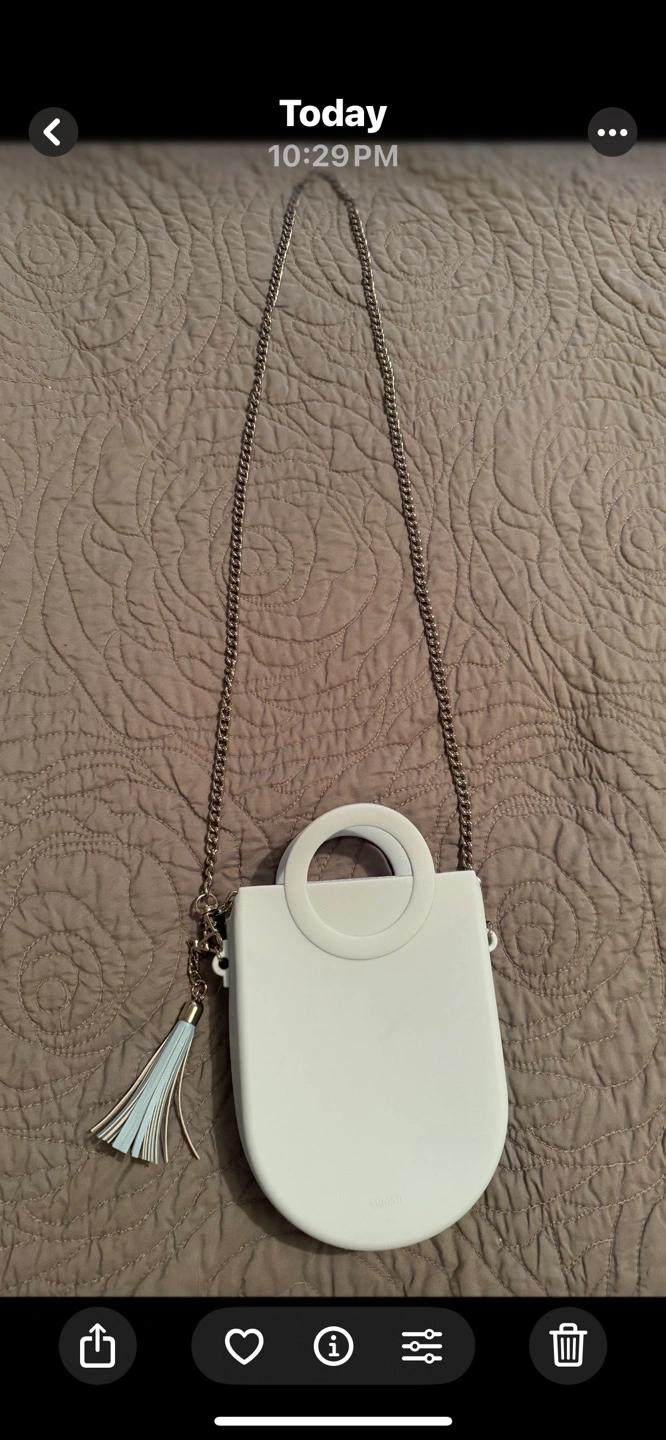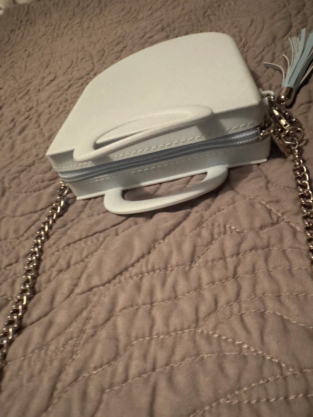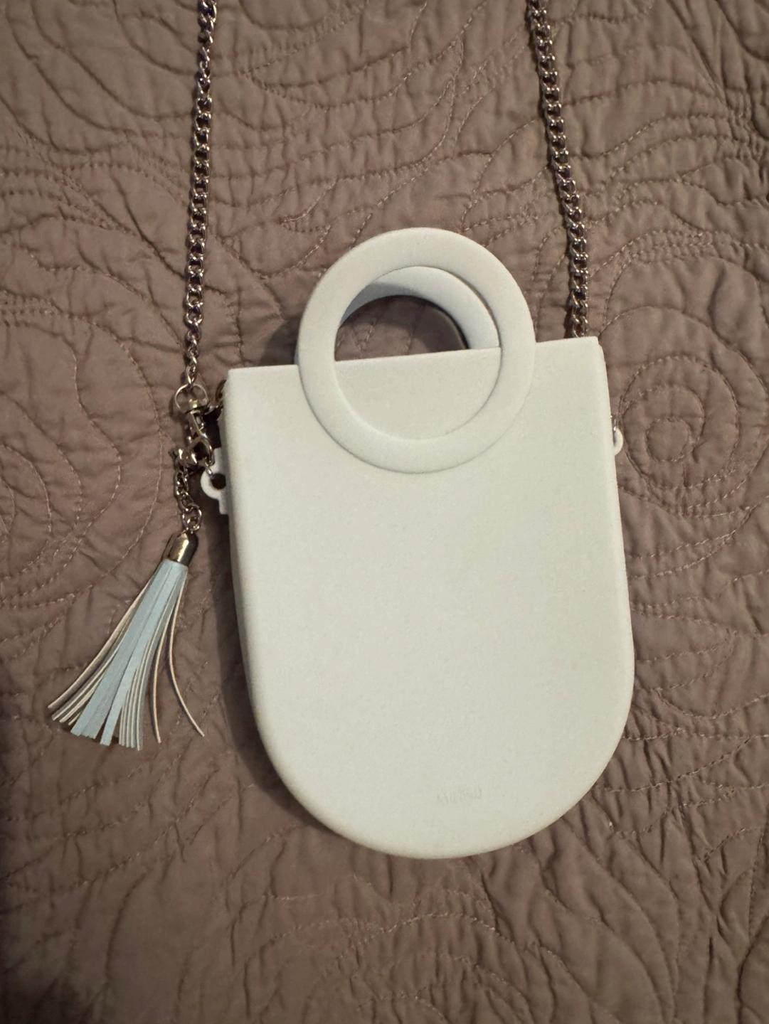 60Small rubber light blue bag. it has a curved shape, top handle, and detachable chain strap. Includes a tassel charm. Zipper closure.