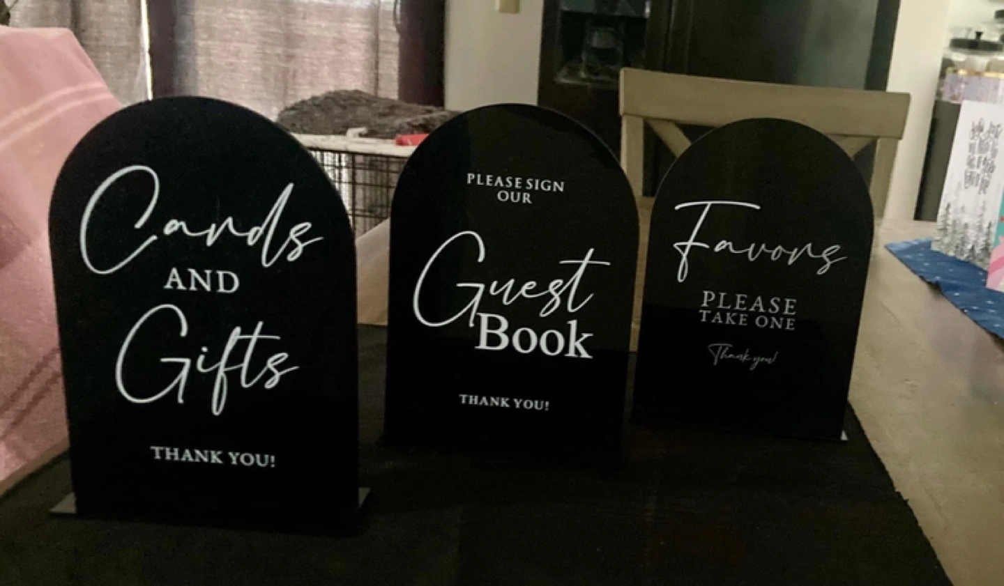 Three black acrylic wedding signs. Arch top design. Perfect for wedding reception. For wedding