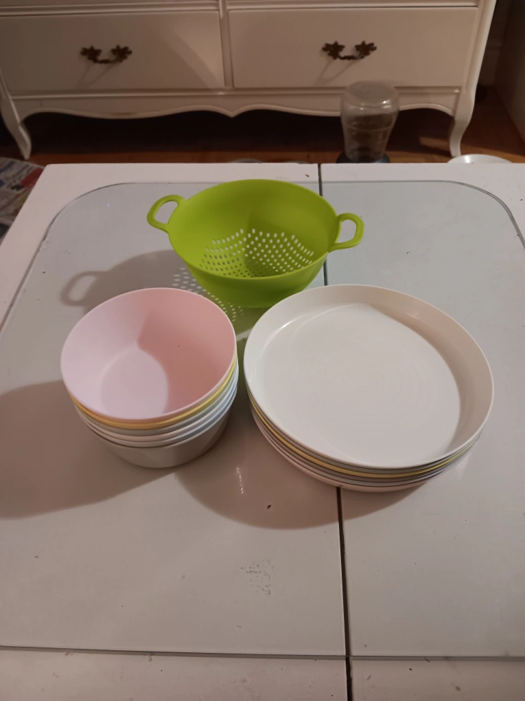 Set of pastel-coloured plastic bowls and plates. Includes a green plastic colander. Stackable and space-saving. bowls 5", plates 7" and colander 6"