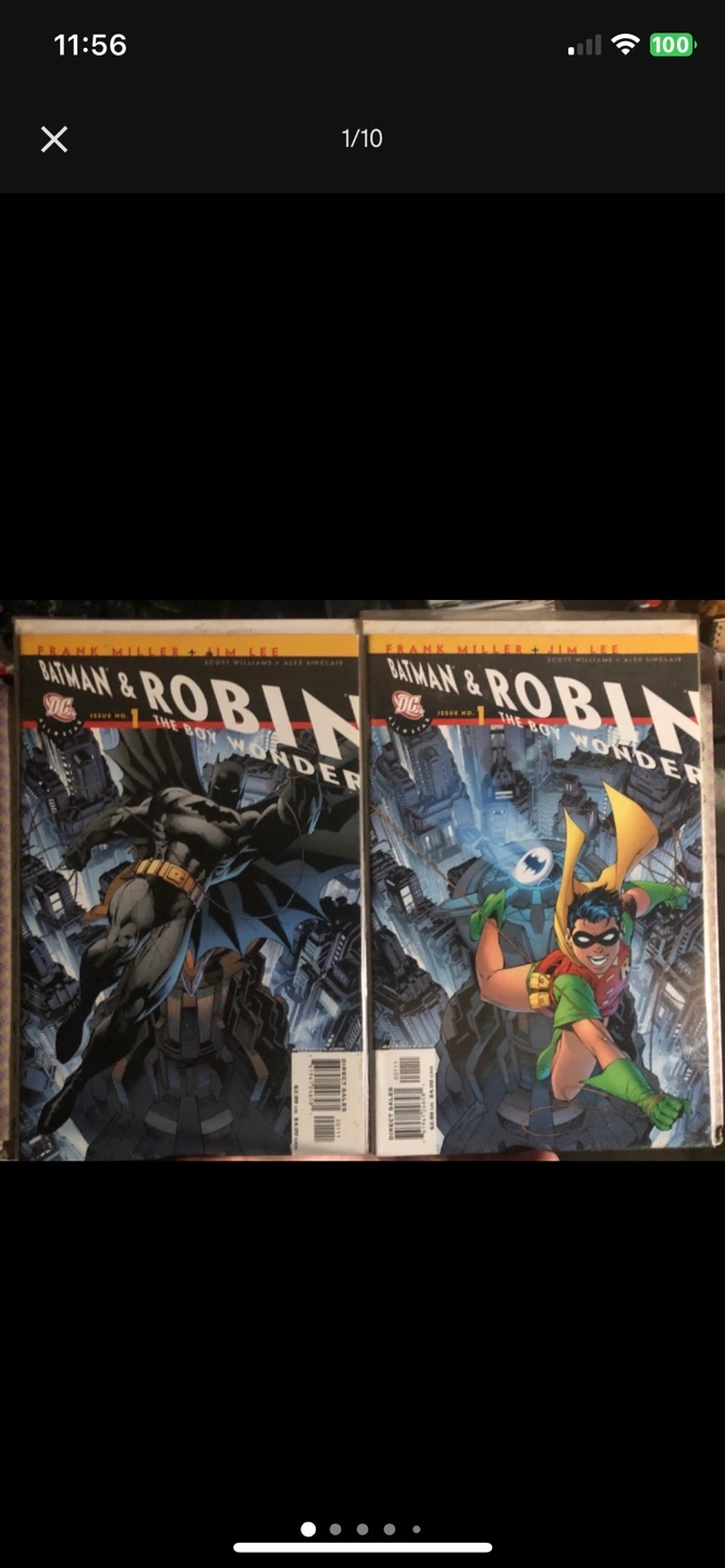 All Star Batman and Robin the Boy Wonder issues 1-10 by Frank Miller and Jim Lee. Two versions of issue 1. Frank Miller variant of issue 2. Rare recalled misprint of issue 10. Visible swear words from Batgirl’s potty mouth!! lol Curb side pickup You pay shipping Buy multiple items for a discount
