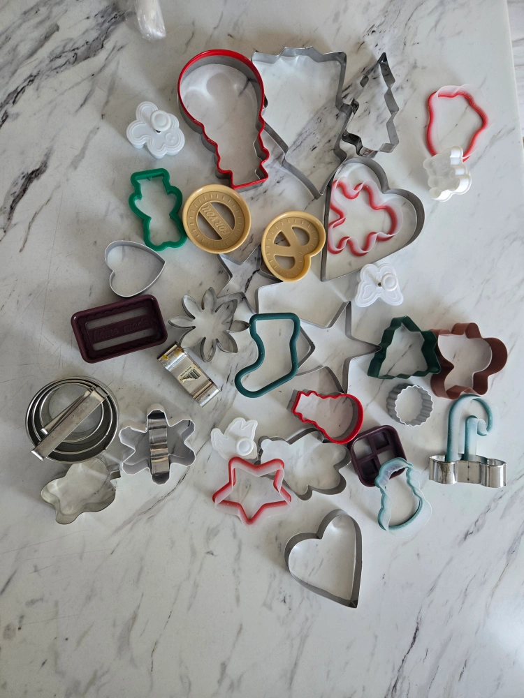 Assortment of metal and plastic cookie cutters. Various shapes and sizes. Includes Christmas shapes, animals, and hearts. Some show minor wear.
