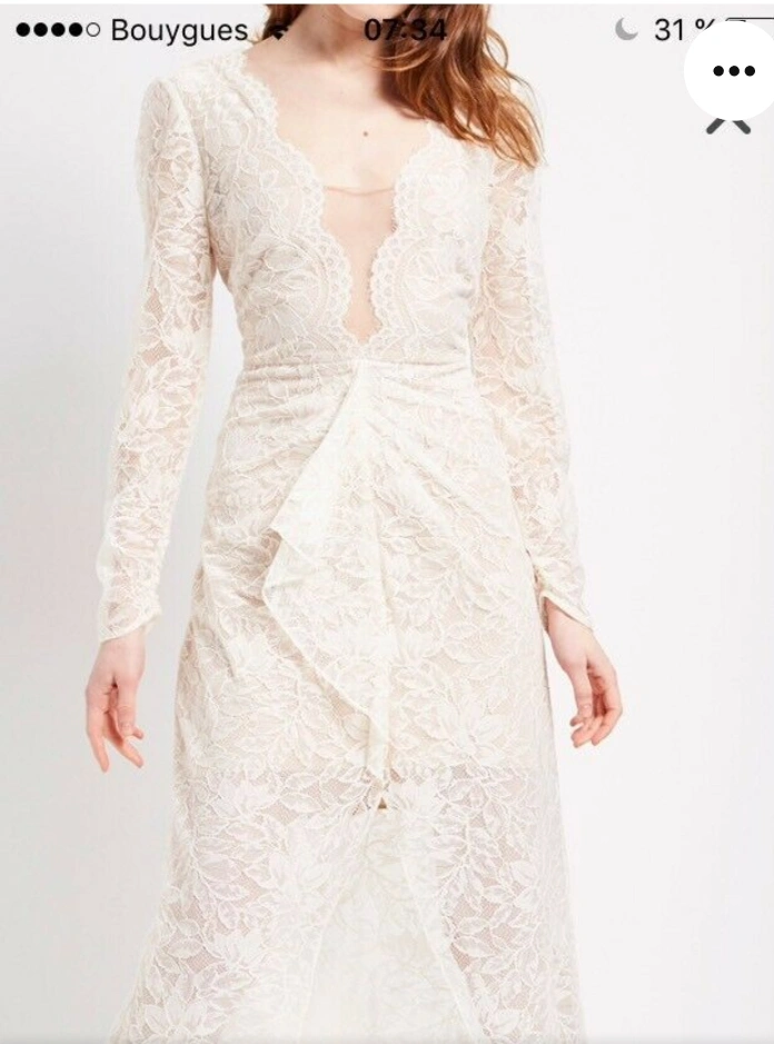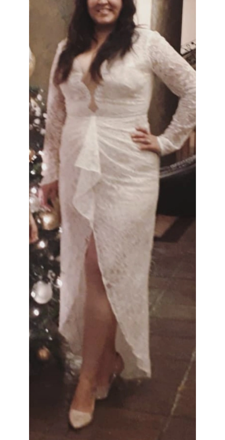Gorgeous gown. Features long sleeves, a plunging neckline, and a thigh-high slit. Delicate lace fabric. Perfect for special occasions. worn once and never again