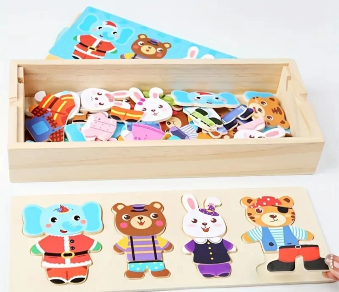 152*** It's a new product. Adorable wooden puzzle features cute animal characters. Includes multiple clothing pieces and matching game cards. Perfect for toddlers. Comes in a convenient wooden storage box.