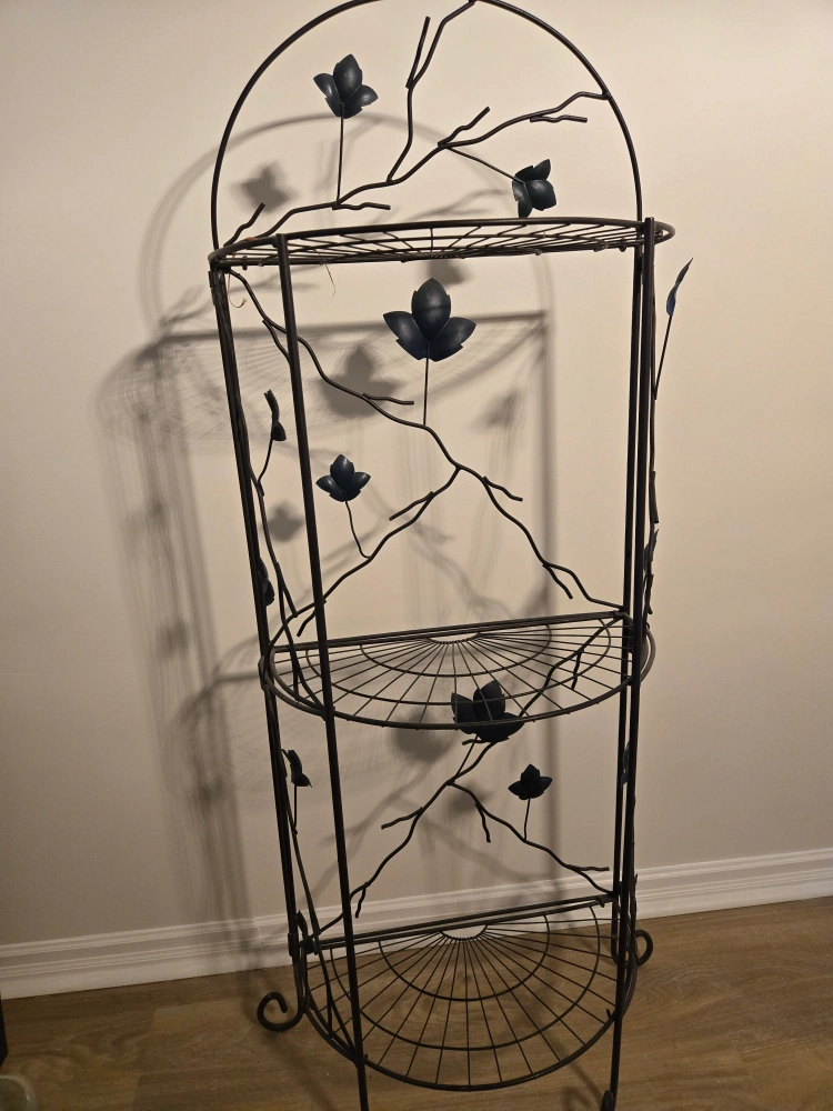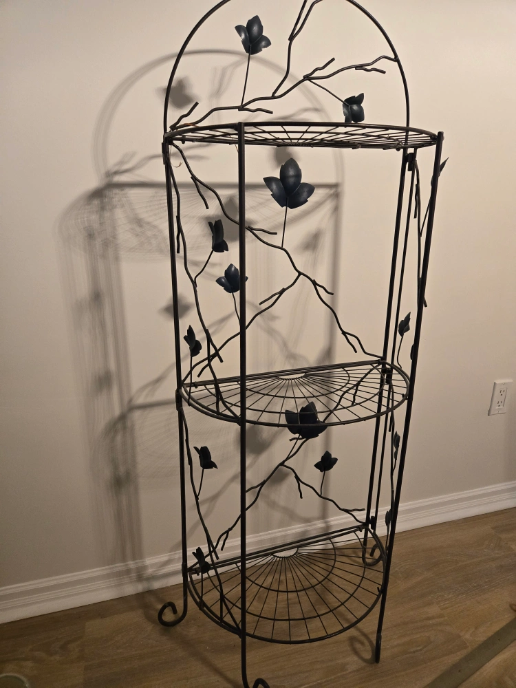 Ornate metal plant stand. Three tiers. Black finish. Floral accents. Good condition.