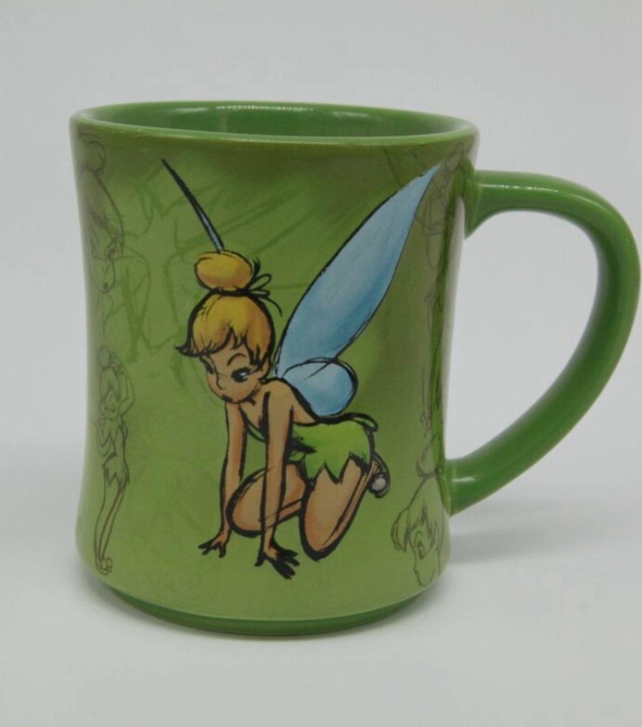 Olive green 3d ceramic mug. Features Tinkerbell images. Microwave and dishwasher safe.