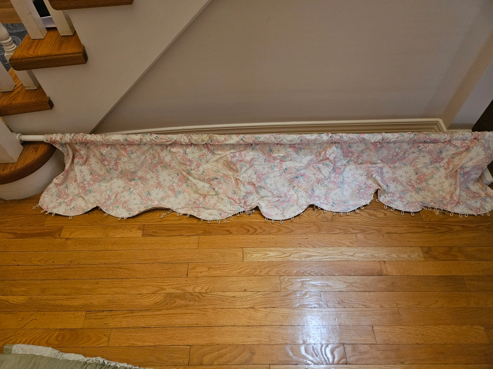 window treatments.1 long beige curtains with floral pattern. Two valances, one pale green and one pink white curtain rod is 81" long give or take other is 83" l give or take.