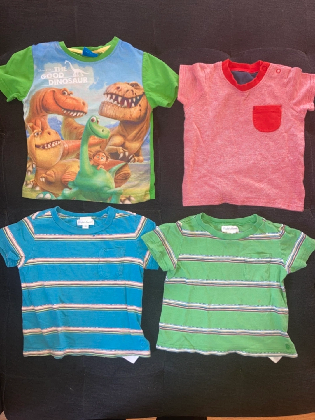 Bundle of four toddler boys' t-shirts in various 9-18 month sizes. *Disney ‘The Good Dinosaur'. *George textured red/white shirt with a red pocket * Two Ralph Lauren striped shirts in teal and green. Green one has a small stain. Pre-owned.