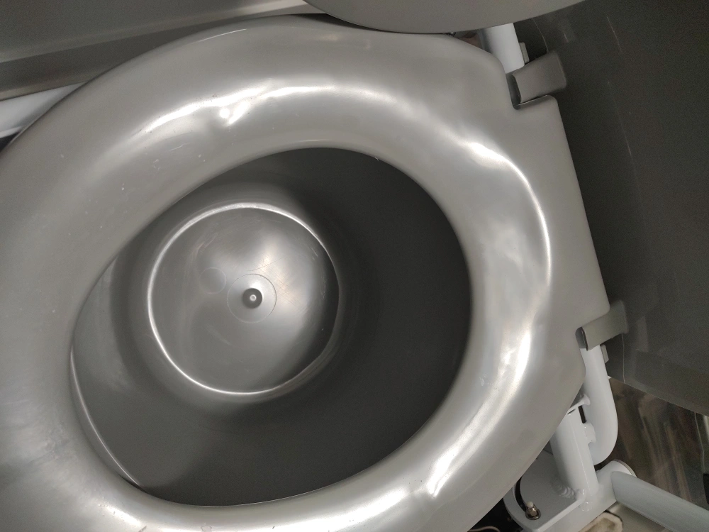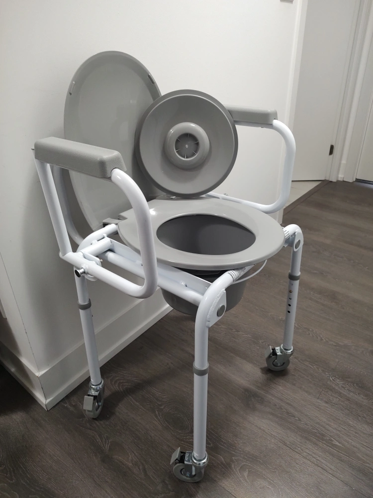 Grey and white elevated toilet seat. Features wheels for mobility. Includes a removable pail. Armrests for support. Easy to clean. Pristine condition. Only used for 4 showers. Worth over $200 on Amazon