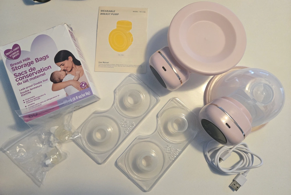 Wearable breast pump, top suction. Hand free. Includes two pump units, flanges inserts, and breast milk storage bags. USB charging cable.