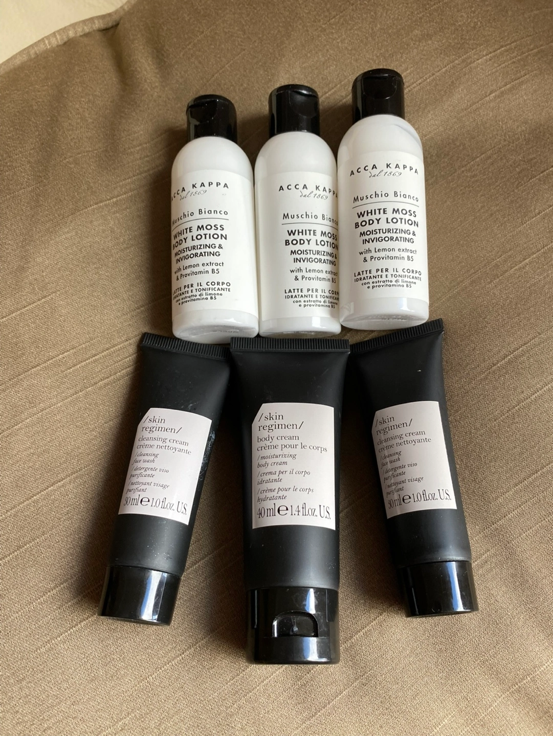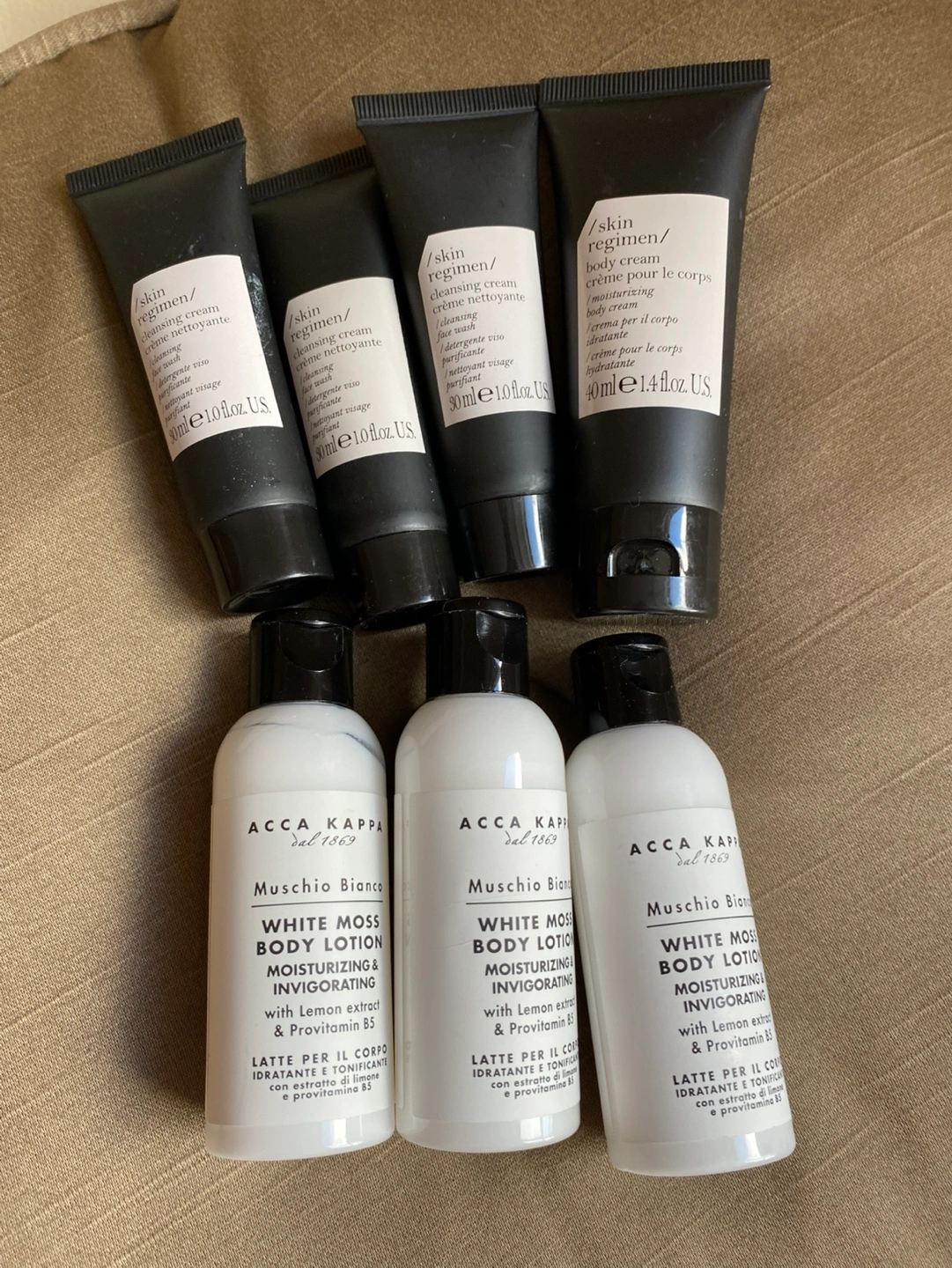 Assortment of travel-size lotions and creams. Includes four tubes of Skin regimen cleansing cream and three bottles of Acca Kappa White Moss body lotion. Perfect for travel or as samples. From a pet and smoke free home. Pickup only in the St Lawrence market area of downtown Toronto. Cash only.