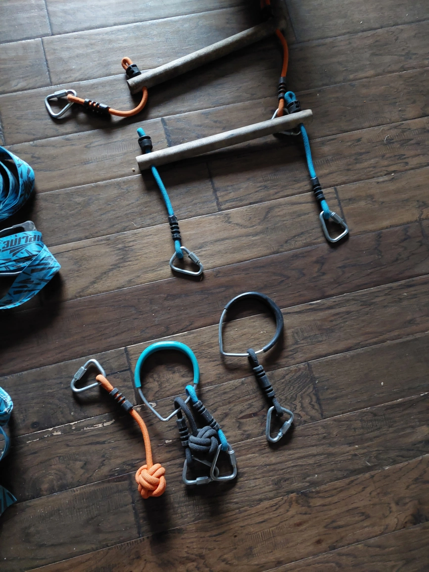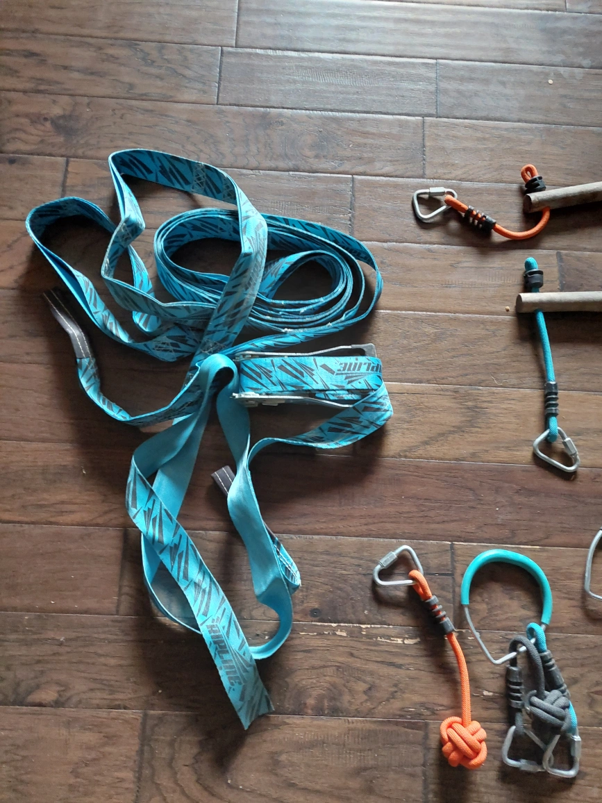 Used climbing equipment. Includes webbing, wooden climbing bars, and carabiners. Suitable for indoor climbing or playground use. Sold as is.
