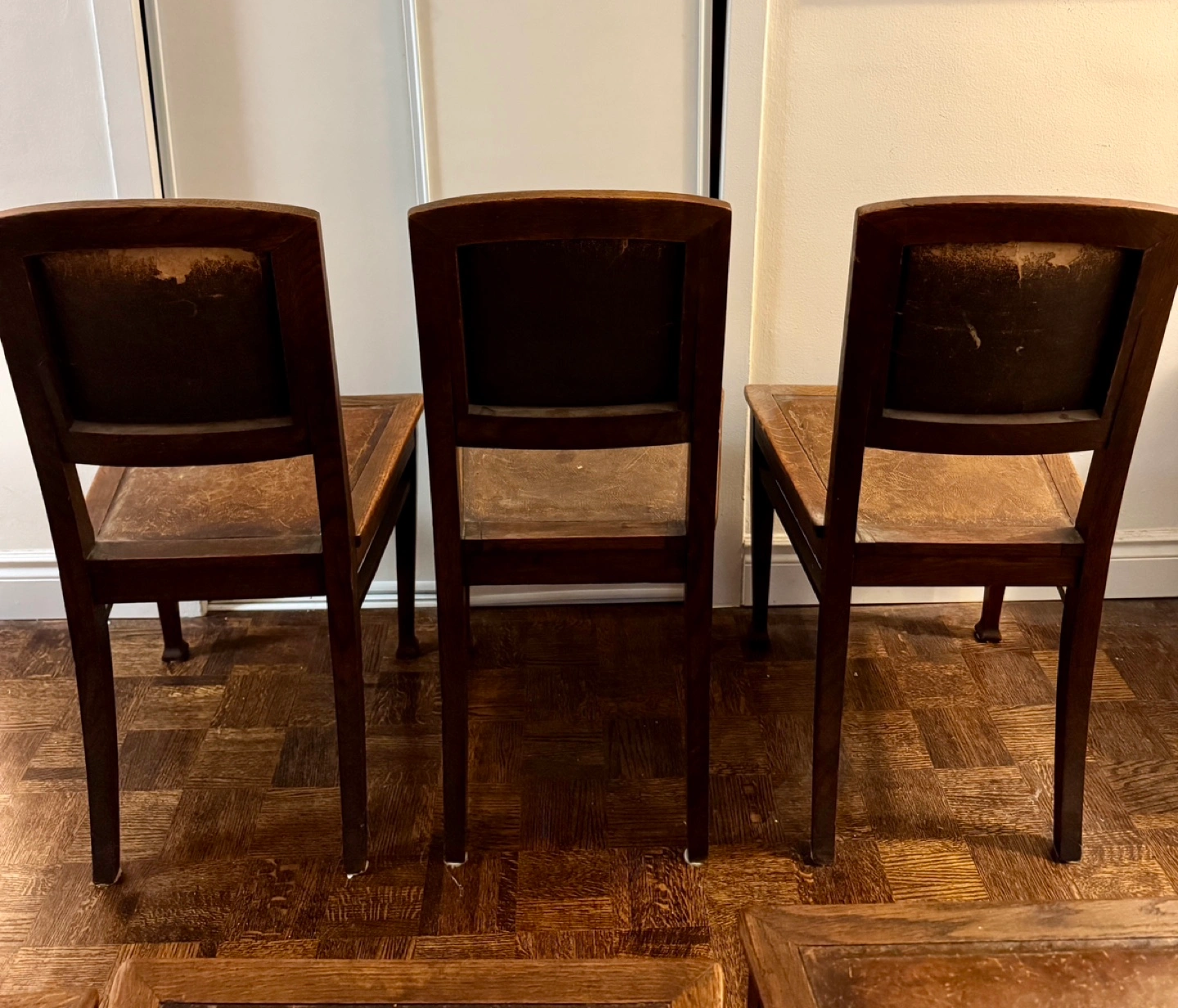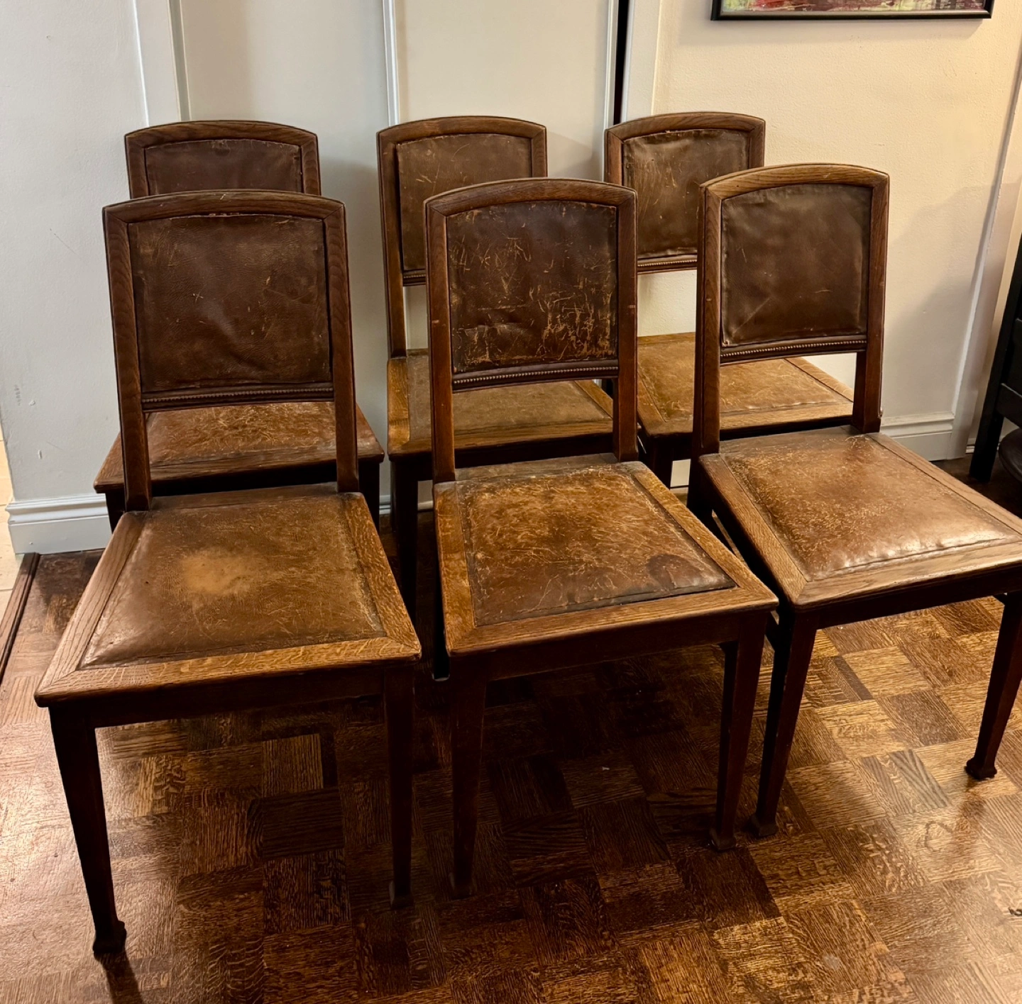 115Six vintage mission style dining chairs. Solid oak wood frame. Leather seats show wear however the wide seats make them very comfortable. Could use a little restoration but are ready for use. Good solid chairs Back to chair is 35” high Front of Seat is 18” wide and 17” long Pick up only. Cash preferred