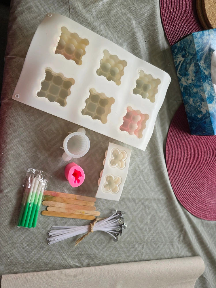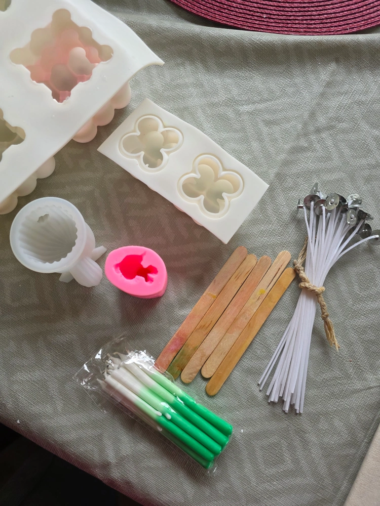 LAST CHANCE ITEMS WILL BE DONATED TO VALUE VILLAGE AFTER APRIL 17TH This is a bundle of silicone moulds for candle making. All of them are in like new condition. Other freebies include candle making wicks, some stir sticks, and a pack of birthday candles, some used mostly unused. Take everything for $5