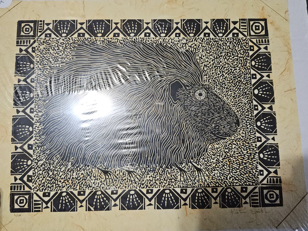 92Unique vintage linocut print featuring a capybara. Black ink on off-white paper. Intricate border design. Artist's signature visible. Numbered 16/50.