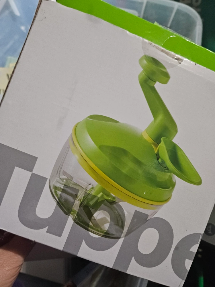 92Brand new Tupperware food chopper. Green and yellow. Easy to use. Perfect for chopping vegetables and herbs.