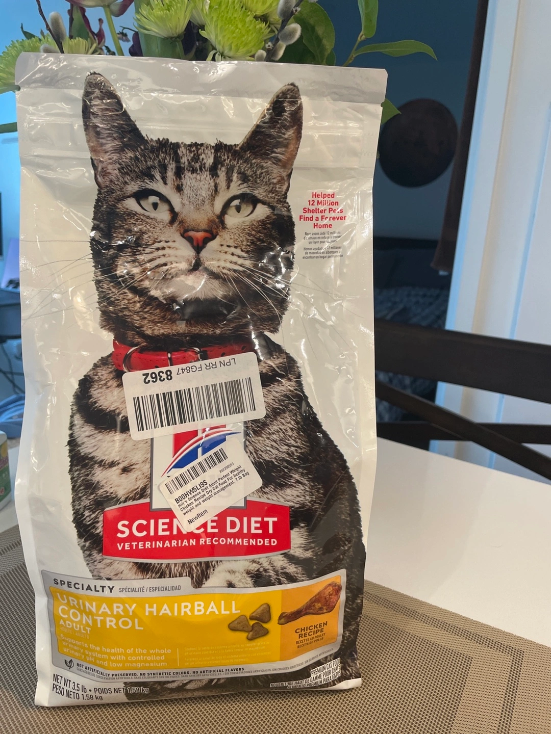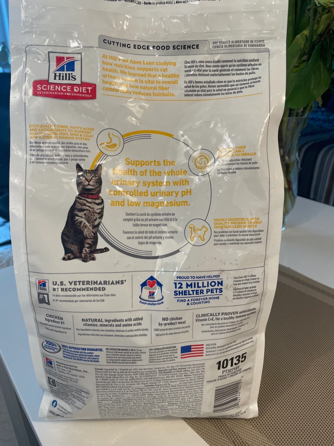 1.58 kg bag of Science Diet cat food. Chicken recipe. For adult cats. Supports urinary health. Veterinarian recommended.