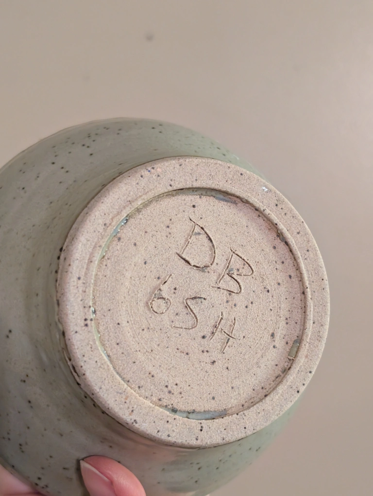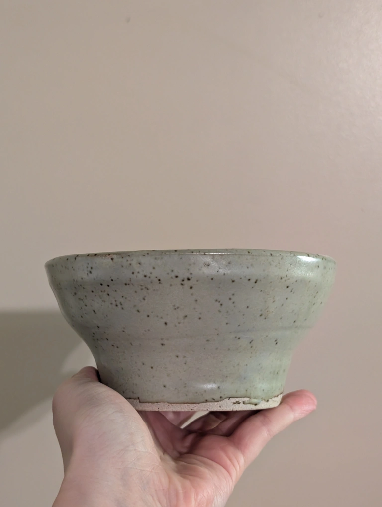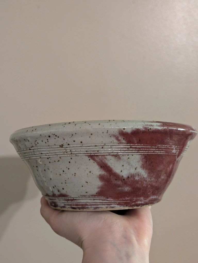 Unique set of two artisan-made bowls. One bowl features a speckled light grey glaze, the other a reddish-brown and grey speckled glaze. Perfect for snacks or decor.