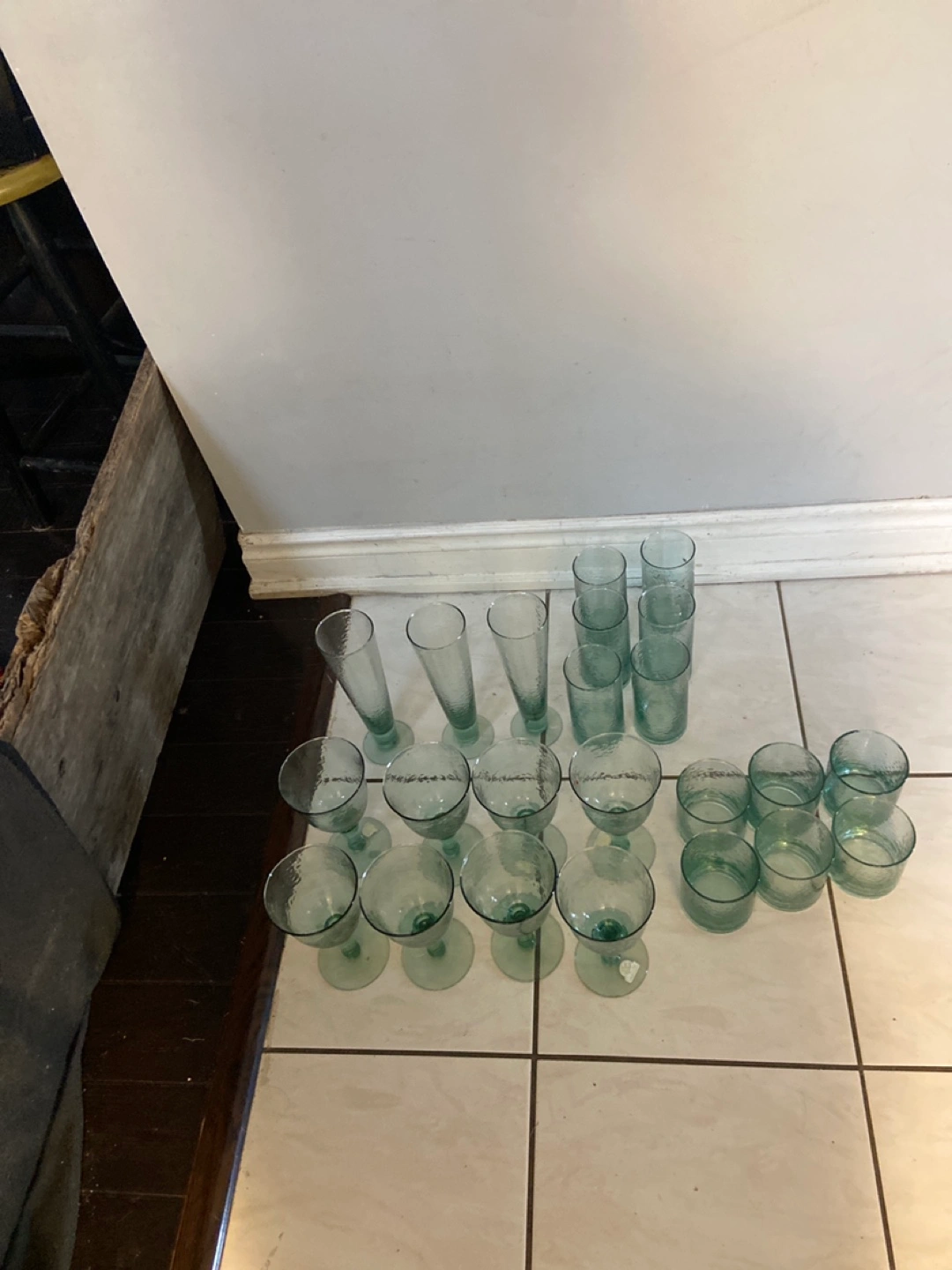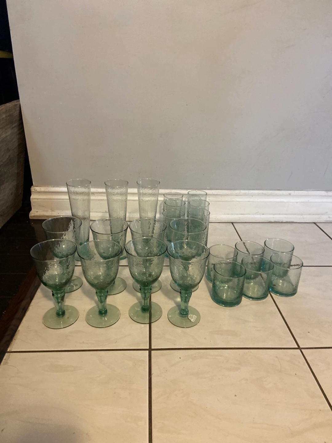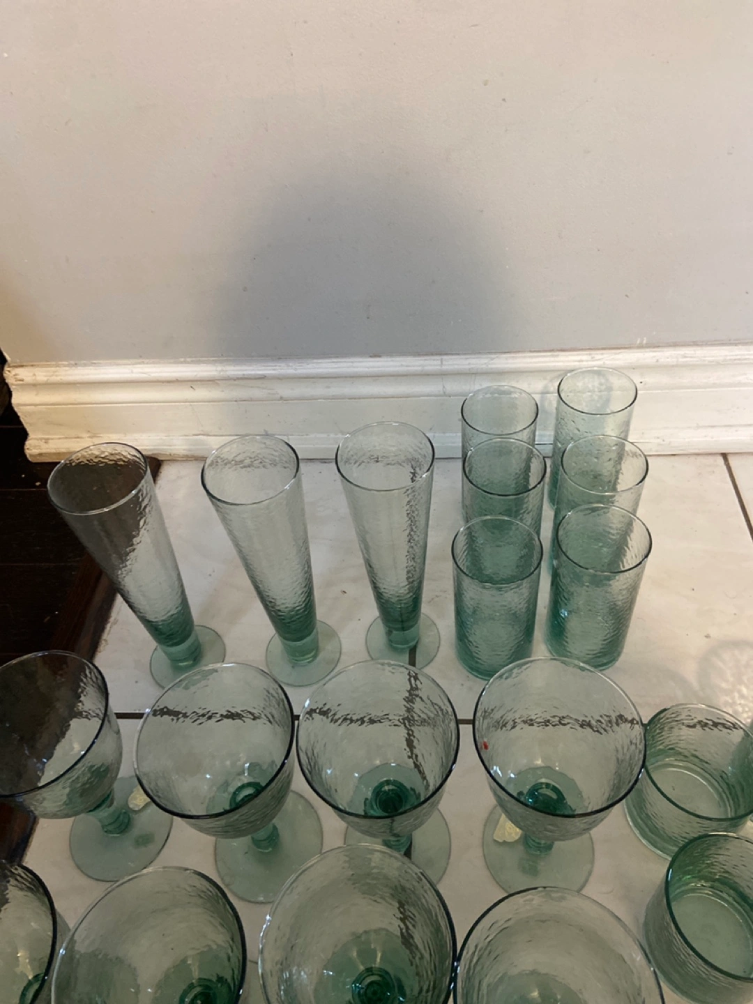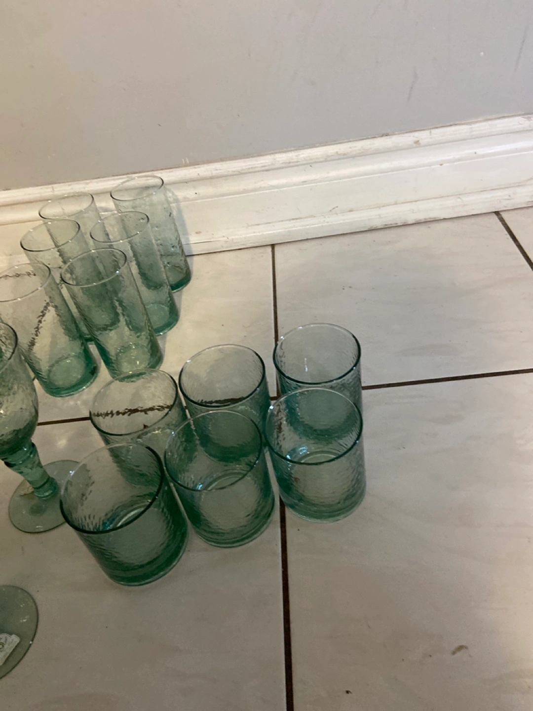 815Large collection of green hammered glass drinkware. Includes various sizes of glasses, tumblers, and wine glasses. Perfect for entertaining. Cheaper than dollar store