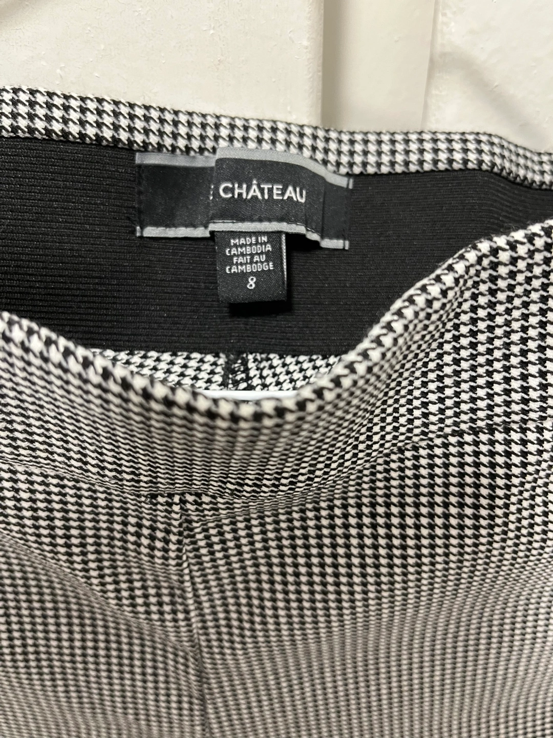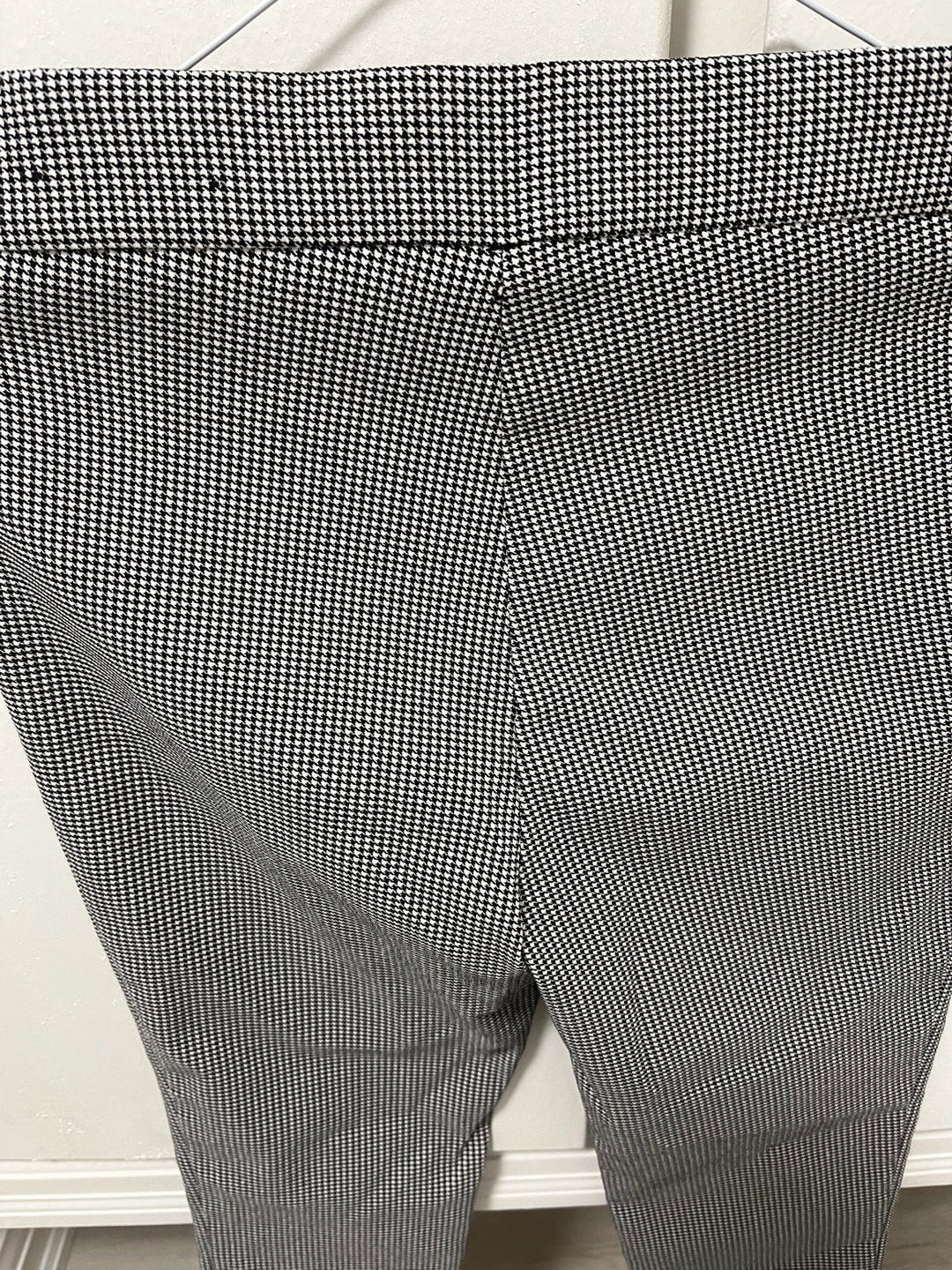 Women's pants, size 8. Black and white houndstooth pattern. Made in Cambodia. Pull-on style. Flattering fit.