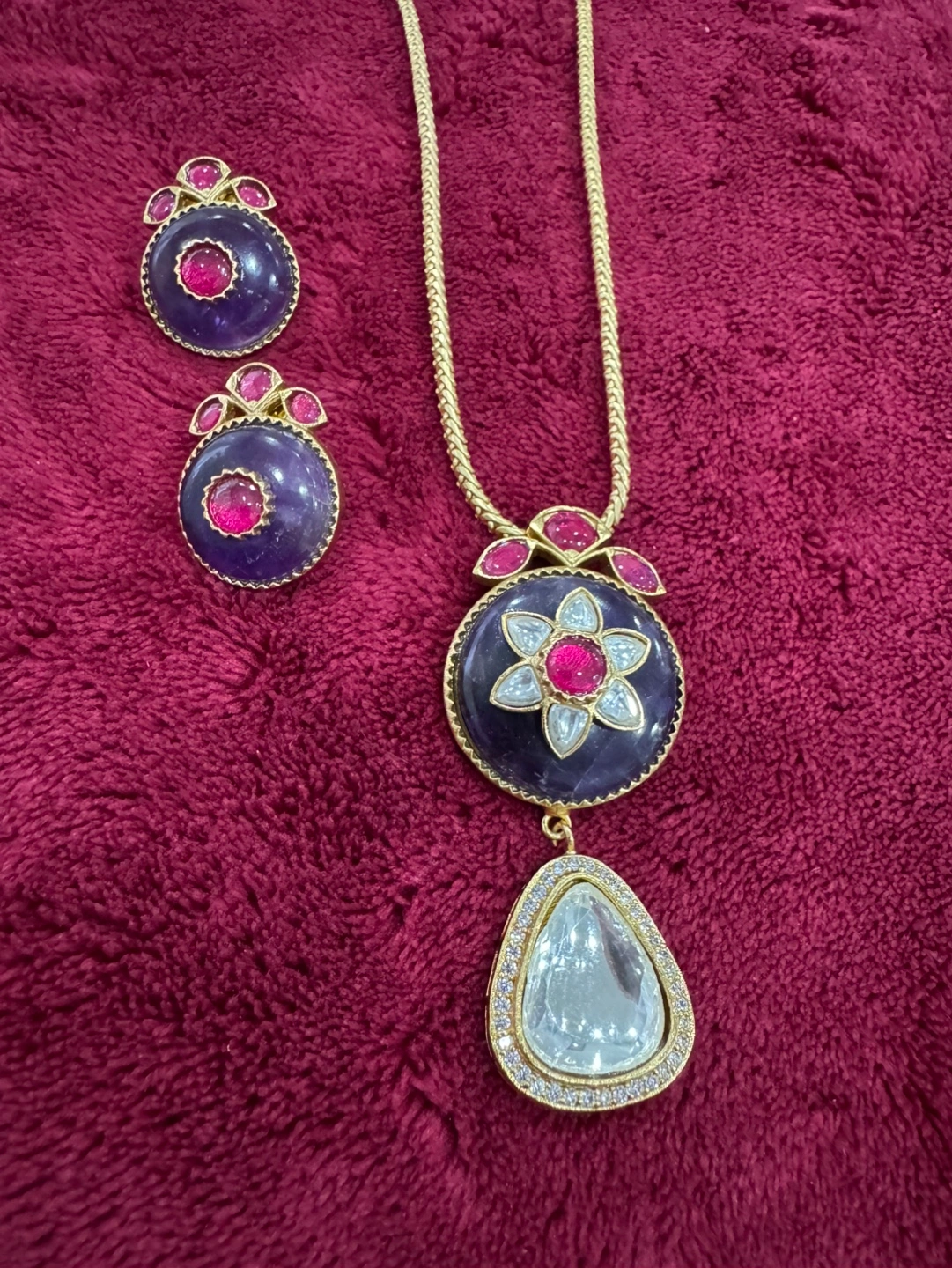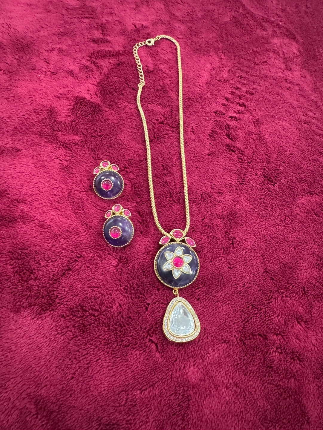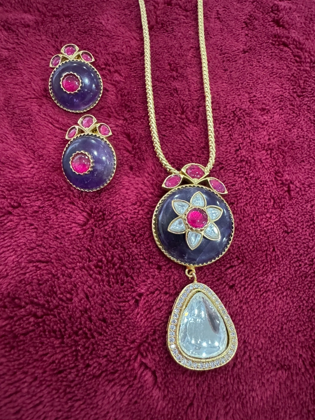 Beautiful necklace set. Features a pendant and matching earrings. Intricate Kundan work. Purple and pink stones. Gold chain.