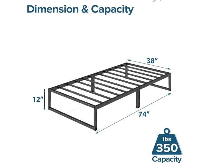 Sturdy metal twin bed frame. Supports up to 350 lbs. Dimensions: 74"L x 38"W x 12"H.