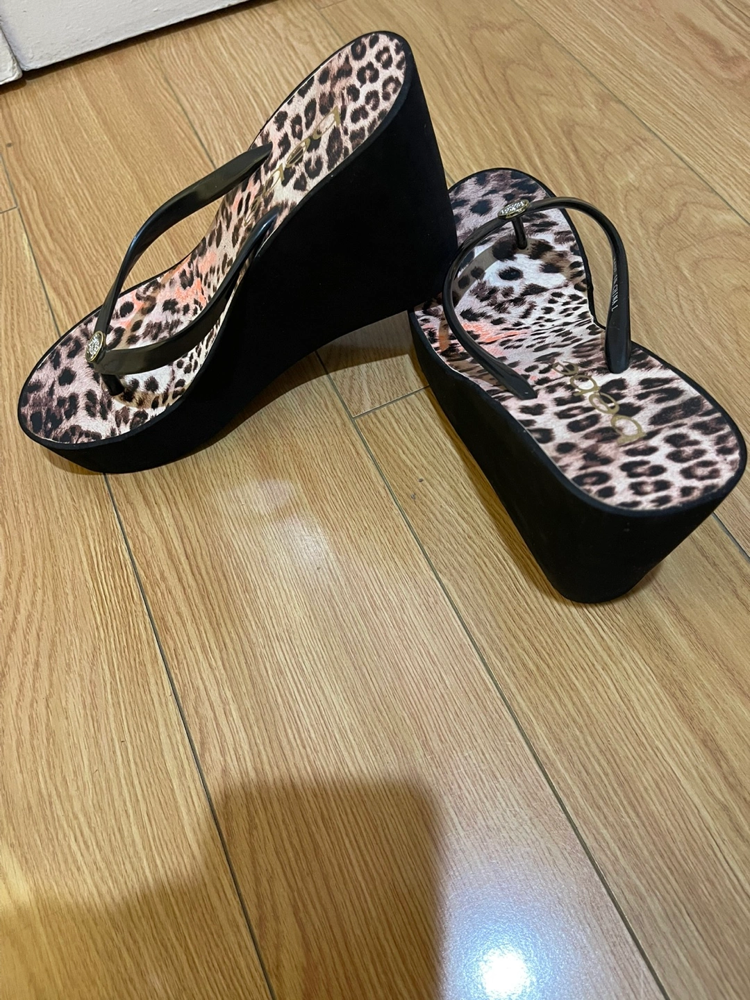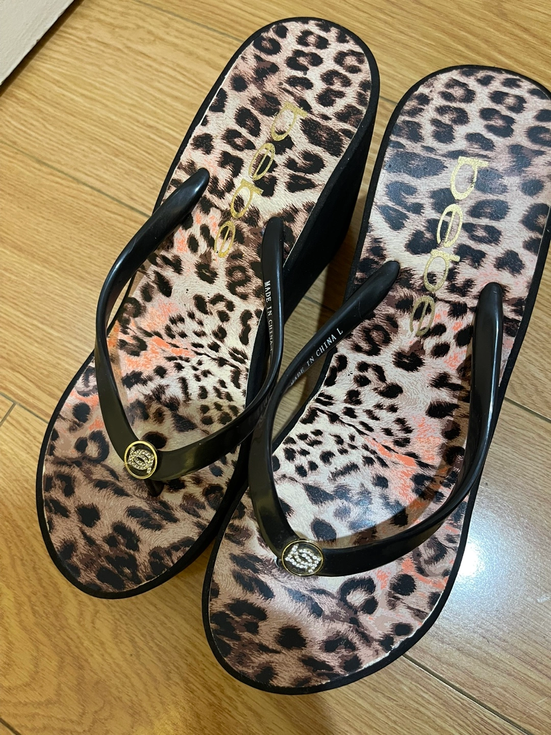 Wedge sandals. Leopard print design. Black soles. Brand new never worn. Got them as gift but were a bit high heeled for me. Bebe brand. Very elegant. Size 8. Combine with items from my other listings for a good price deal
