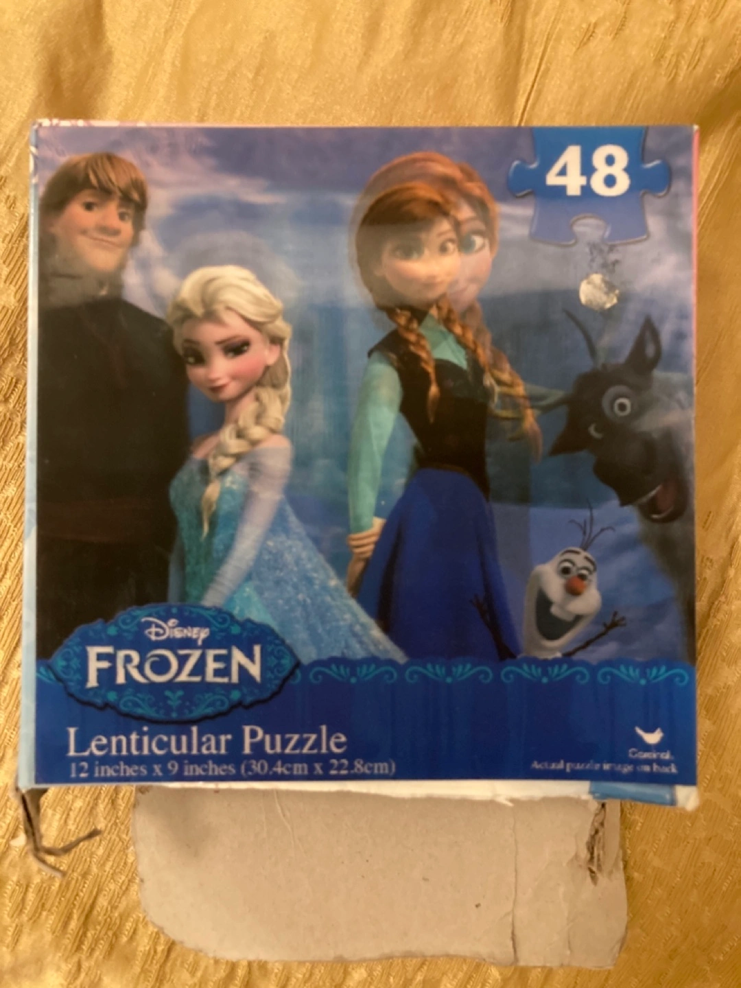 Frozen lenticular puzzle. 48 pieces. Measures 12 x 9 inches (30.4cm x 22.8cm). Features Elsa, Anna, Kristoff, and Olaf.