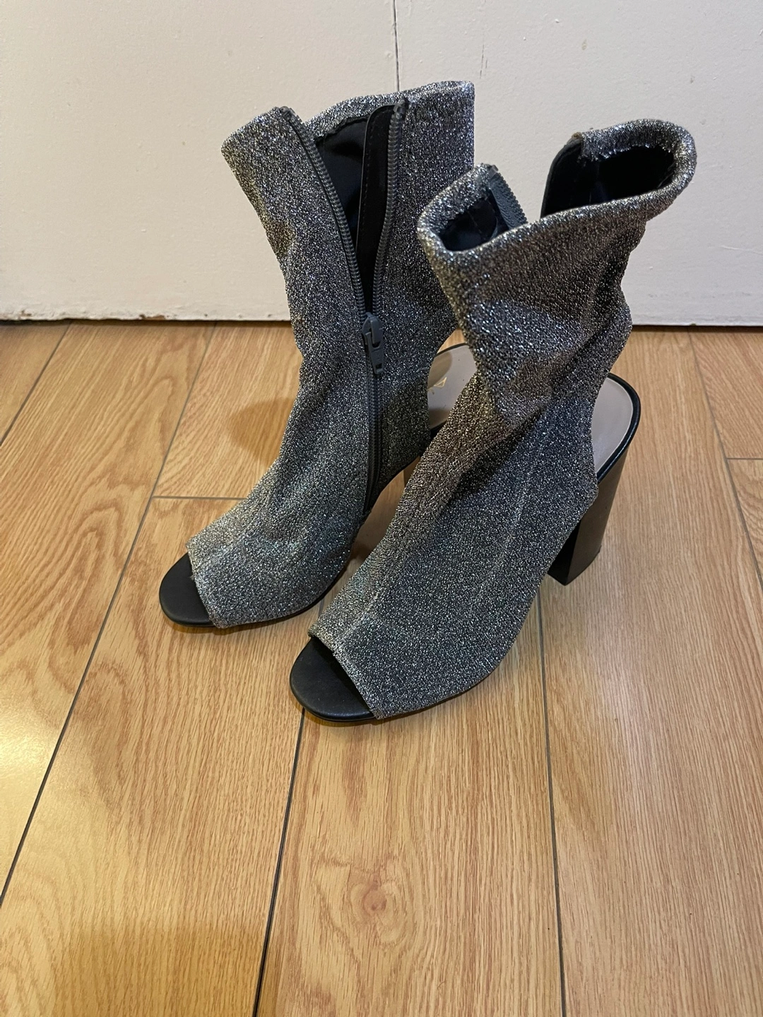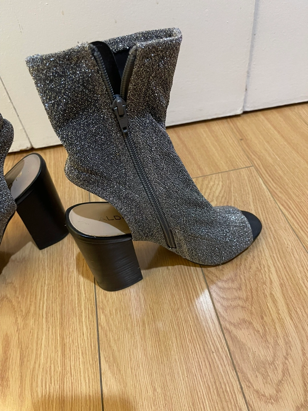 Silver glitter booties with a block heel and side zipper. Peep toe design. Size 7.5. Aldo. Brand new never worn. Very elegant, stylish and comfortable at the same time. Has outsole grip applied to the bottom.