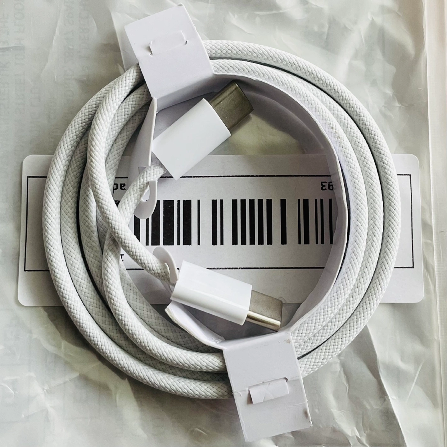 New white braided USB-C charging cable. Durable and stylish design. Perfect for your phone or tablet.