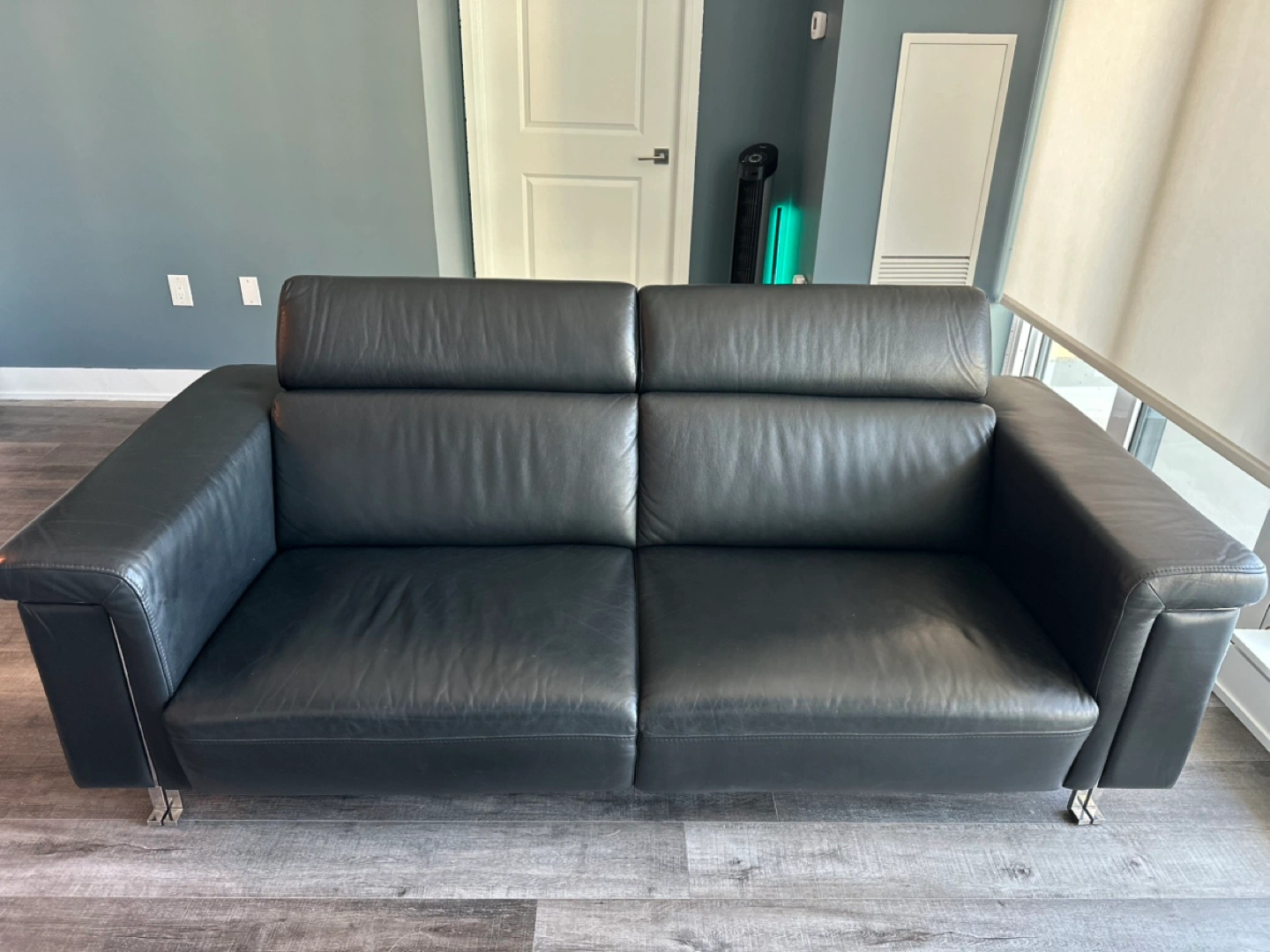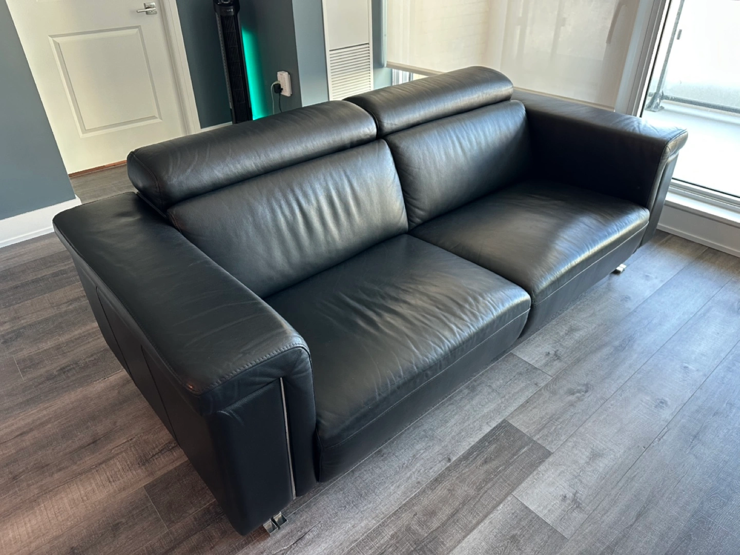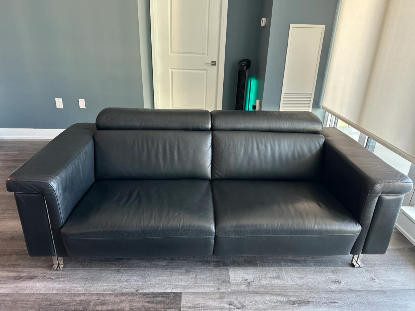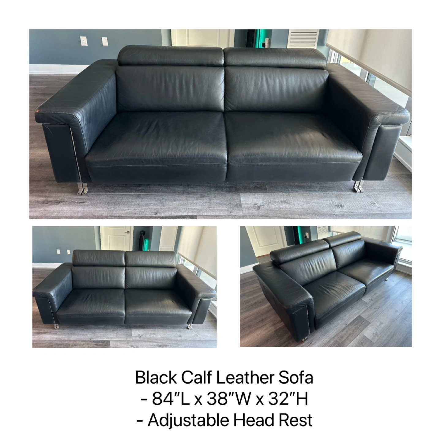 116Stylish black calf leather sofa. Measures 84"Wx 38"Dx 32"H. Features adjustable headrests. Modern design, great for a living room.