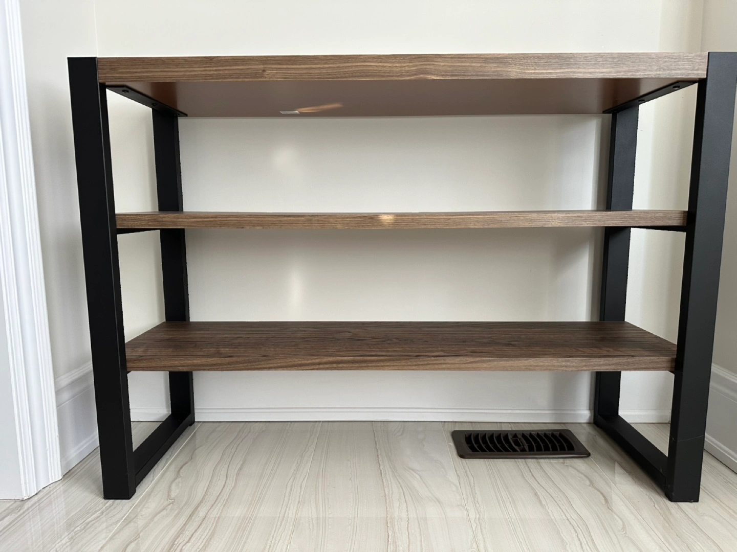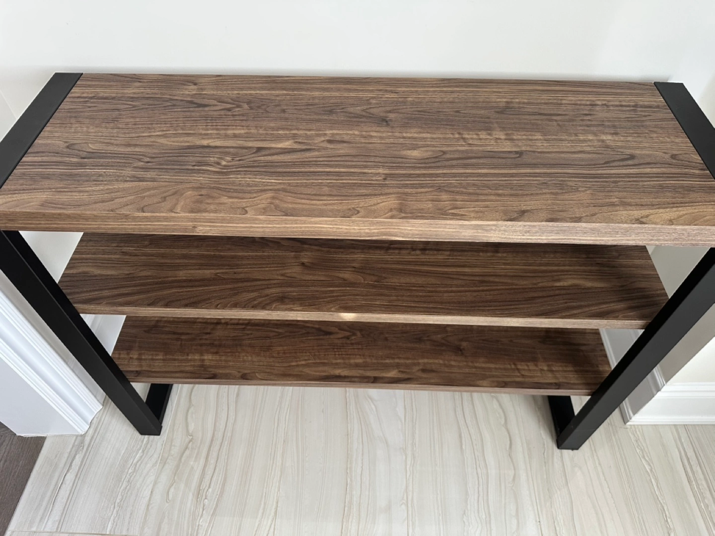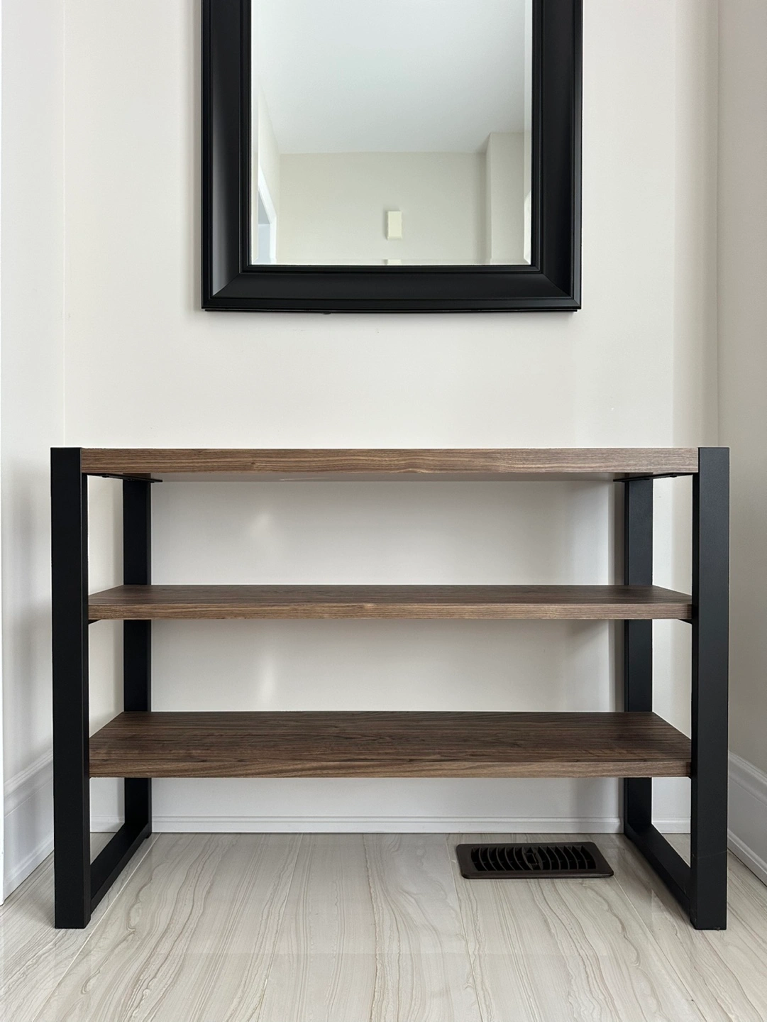 116Stylish console table. Features a dark walnut wood top and two shelves. Black metal frame. Perfect for entryway or living room. Mirror sold separately.